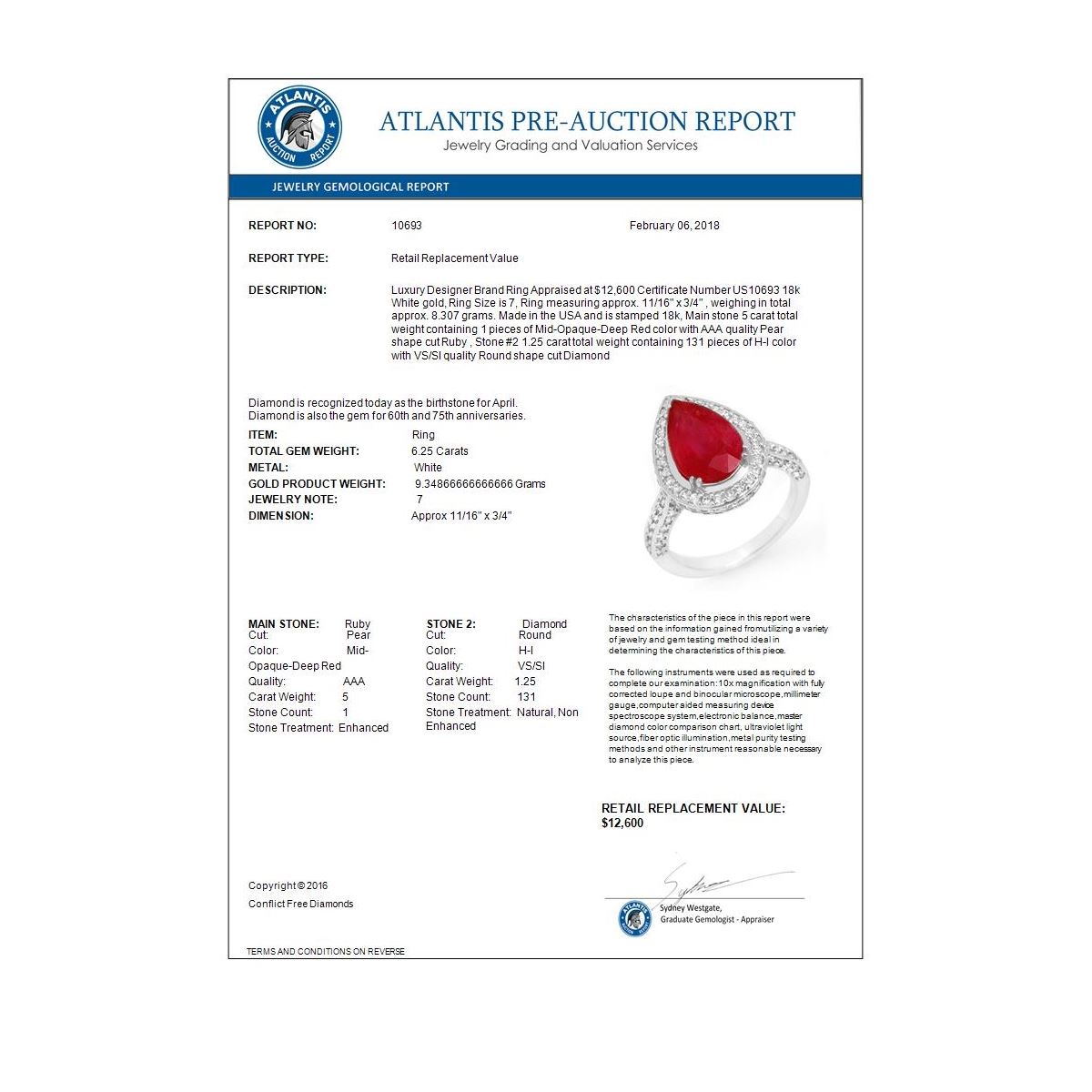 REF-163W6F -10693 ---- 6.25 CTW Ruby & Diamond Ring 18K White Gold ---- Luxury Designer Brand Ring Appraised at $12,600 Certificate Number US10693 18k White gold, Ring Size is 7, Ring measuring approx. 11/16" x 3/4" , weighing in total approx. 8.307 grams. Made in the USA and is stamped 18k, Main stone 5 carat total weight containing 1 pieces of Mid-Opaque-Deep Red color with AAA quality Pear shape cut Ruby , Stone #2 1.25 carat total weight containing 131 pieces of H-I color with VS/SI quality Round shape cut Diamond