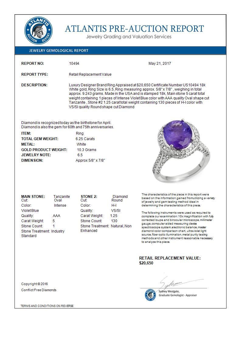 6.25 CTW Tanzanite & Diamond Ring 18K White Gold ---- Luxury Designer Brand Ring Appraised Retail Price at $20,650 ---- SKU Number US10494 18k White gold Ring Size is 6.5, Ring measuring approx. 5/8" x 7/8" , weighing in total approx. 9.243 grams. Made in the USA and is stamped 18k, Main stone 5 carat total weight containing 1 pieces of Intense Violet Blue color with AAA quality Oval shape cut Tanzanite , Stone #2 1.25 carat total weight containing 130 pieces of H-I color with VS/SI quality Round shape cut