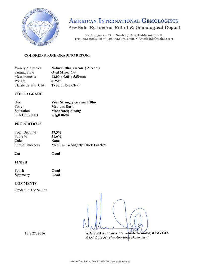 One electronically tested 18KT white gold ladies cast & assembled blue zircon and diamond ring. The featured blue zircon is set within an inner yellow diamond bezel and a tiered outer white diamond bezel supported by a white diamond set under gallery and diamond set shoulders, completed by a two and one-half millimeter wide band. Bright polish finish with a yellow gold overlay and milgrain detailing. Identified with markings of '18K'. Condition is new, good workmanship. Containing: One prong set oval mixed cut natural blue zircon, measuring 12.00 x 9.60 x 5.50mm, approximate weight of 6.25ct., clarity is eye clean, type I, medium dark, moderately strong, very strongly greenish blue color, (GIA vstgB 6/4), cut is good. Transmitting light with no distortion, transparent. Colored Stone Grading Report attached. Graded in the setting. Twenty-Two prong set round brilliant cut diamonds, measuring 2.00 - 1.90 x 1.17mm (depth est.) approximate total weight of 22 Stones = 0.65ct. Color grade is an average for the group. Indications of laboratory irradiated enhanced color. Graded in the setting. Clarity VS-2 to SI-1 Sixty-Seven prong set round brilliant cut diamonds, measuring 2.10 - 1.60 x 1.11mm (depth est.) approximate total weight of 67 Stones = 1.55ct. Graded in the setting. Clarity VS-2 to SI-1. Color: G - I. Total Weight of Colored Stones 6.25ct.. Total Weight of Diamonds 2.20ct.. Total Weight of Ring 15.95gm. AIG Appraised at $12,630.00.