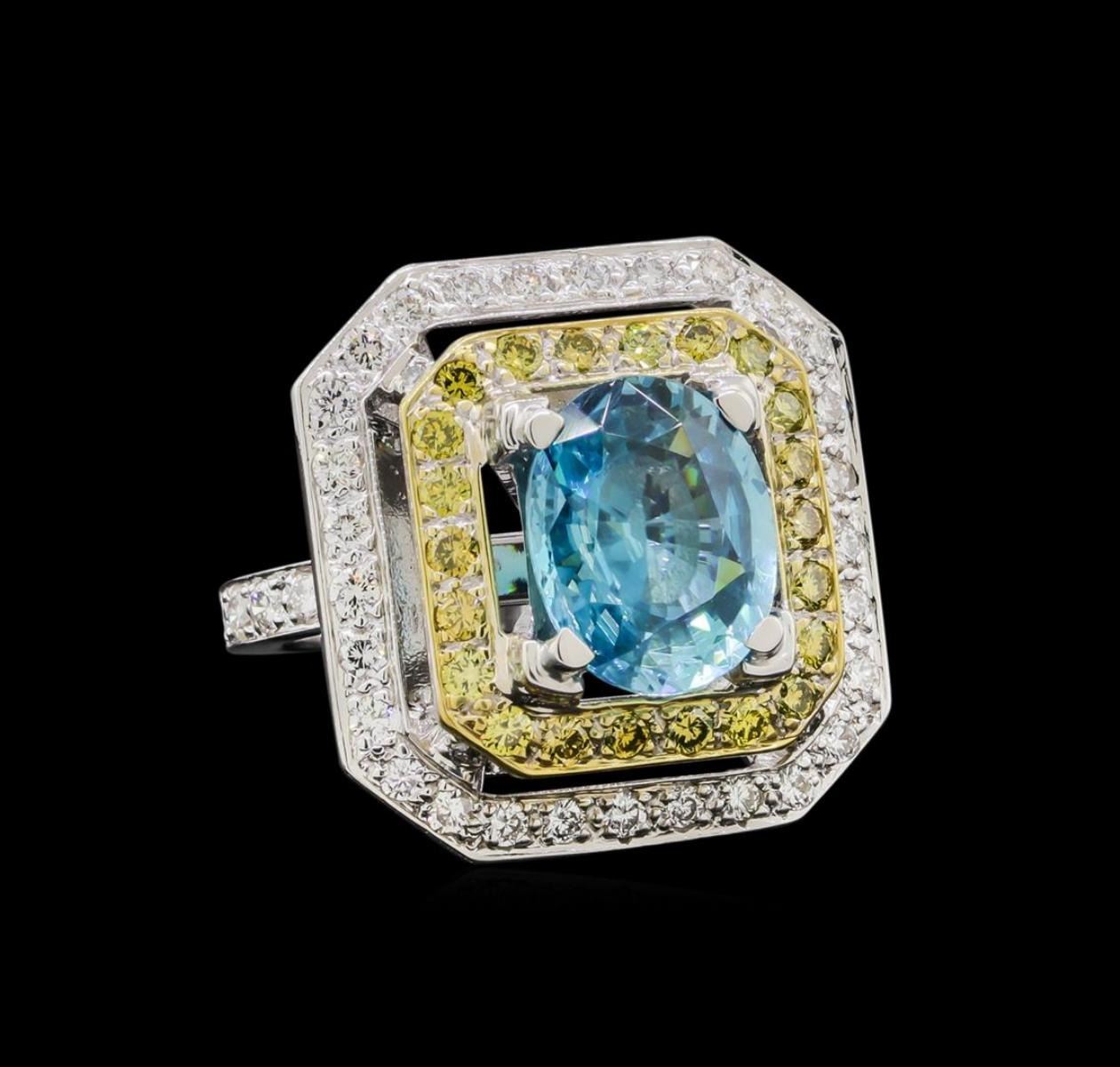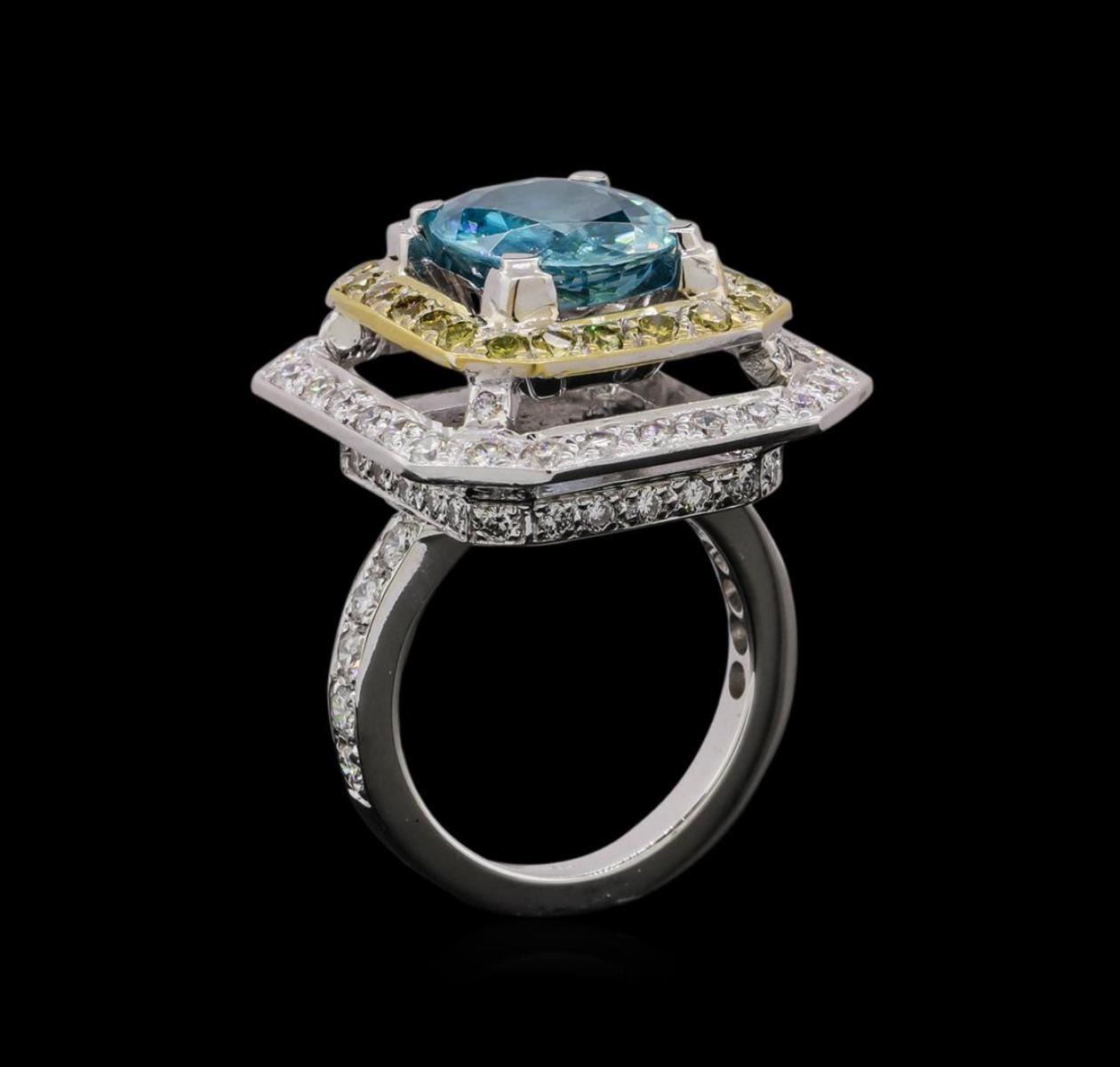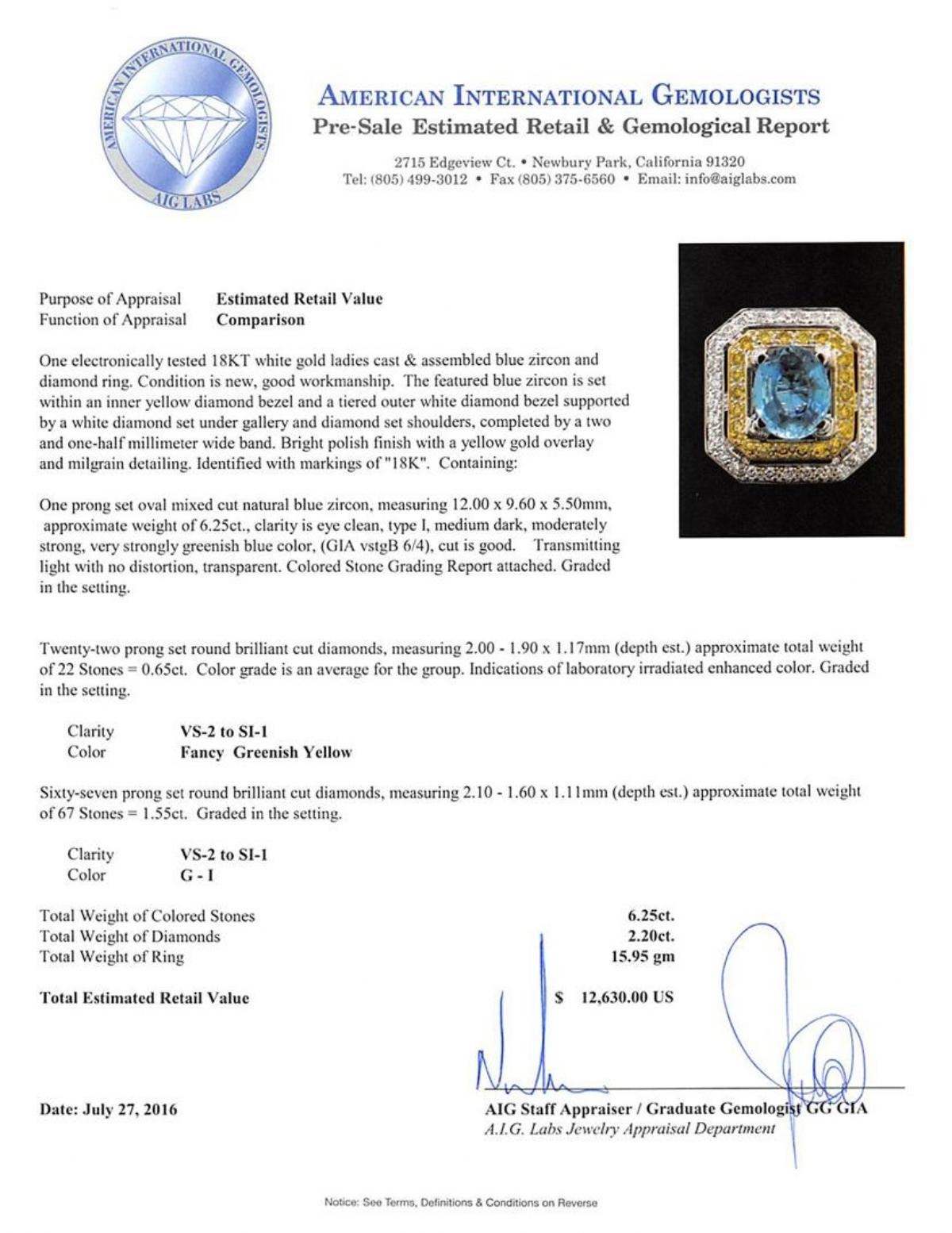 One electronically tested 18KT white gold ladies cast & assembled blue zircon and diamond ring. The featured blue zircon is set within an inner yellow diamond bezel and a tiered outer white diamond bezel supported by a white diamond set under gallery and diamond set shoulders, completed by a two and one-half millimeter wide band. Bright polish finish with a yellow gold overlay and milgrain detailing. Identified with markings of '18K'. Condition is new, good workmanship. Containing: One prong set oval mixed cut natural blue zircon, measuring 12.00 x 9.60 x 5.50mm, approximate weight of 6.25ct., clarity is eye clean, type I, medium dark, moderately strong, very strongly greenish blue color, (GIA vstgB 6/4), cut is good. Transmitting light with no distortion, transparent. Colored Stone Grading Report attached. Graded in the setting. Twenty-Two prong set round brilliant cut diamonds, measuring 2.00 - 1.90 x 1.17mm (depth est.) approximate total weight of 22 Stones = 0.65ct. Color grade is an average for the group. Indications of laboratory irradiated enhanced color. Graded in the setting. Clarity VS-2 to SI-1 Sixty-Seven prong set round brilliant cut diamonds, measuring 2.10 - 1.60 x 1.11mm (depth est.) approximate total weight of 67 Stones = 1.55ct. Graded in the setting. Clarity VS-2 to SI-1. Color: G - I. Total Weight of Colored Stones 6.25ct.. Total Weight of Diamonds 2.20ct.. Total Weight of Ring 15.95gm. AIG Appraised.