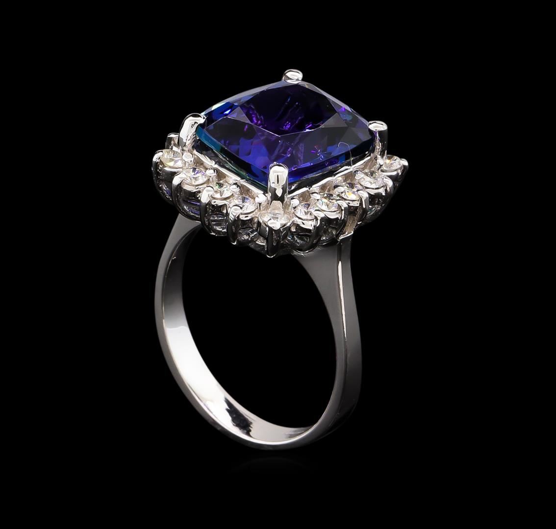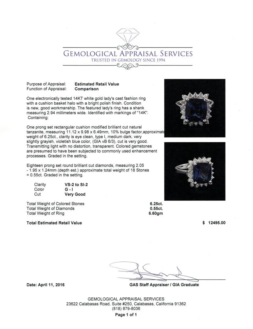 One electronically tested 14KT white gold lady's cast fashion ring with a cushion basket halo with a bright polish finish. The featured lady's ring has a shank measuring 2.94 millimeters wide. Identified with markings of "14K". Condition is new, good workmanship. Containing: One prong set rectangular cushion modified brilliant cut natural tanzanite, measuring 11.12 x 9.98 x 6.49mm, 10%. bulge factor, approximate weight of 6.25ct., clarity is eye clean, type I, medium dark, very slightly grayish, violetish blue color, (GIA vB 6/3), cut is very good. Transmitting light with no distortion, transparent. Colored gemstones are presumed to have been subjected to commonly used enhancement processes. Graded in the setting. Eighteen prong set round brilliant cut diamonds, measuring 2.05 - 1.95 x 1.24mm (depth est.) approximate total weight of 18 Stones = 0.55ct. Graded in the setting. Clarity: VS-2 to SI-2. Color: G - I. Cut Very Good. Total Weight of Colored Stones 6.25ct. Total Weight of Diamonds 0.55ct. Total Weight of Ring 6.60gm. GAS Appraised at $12,495.00.