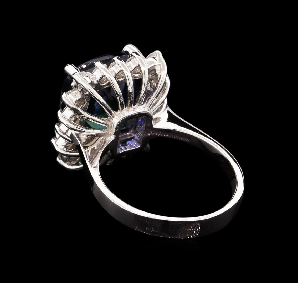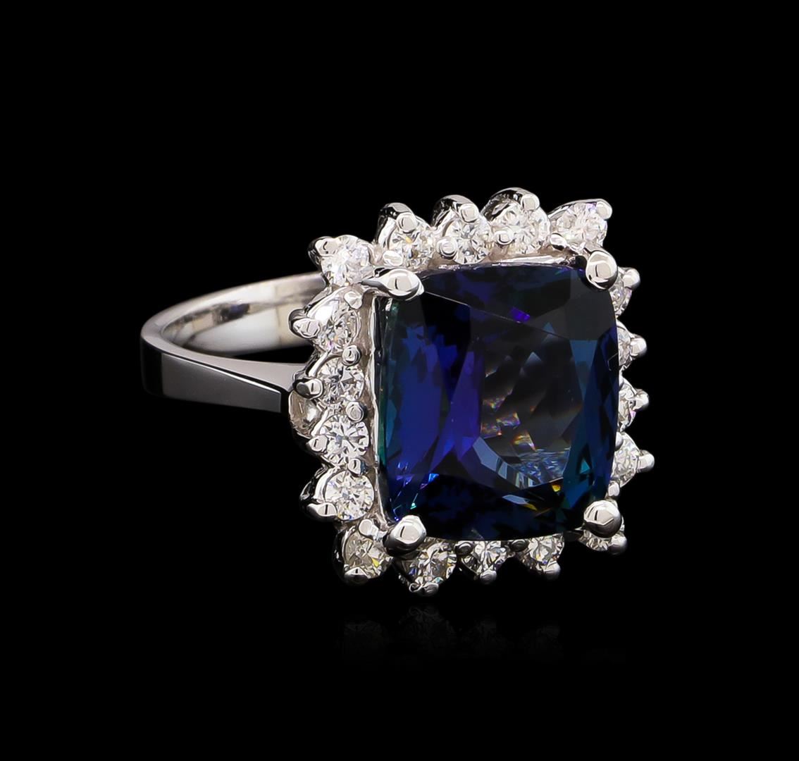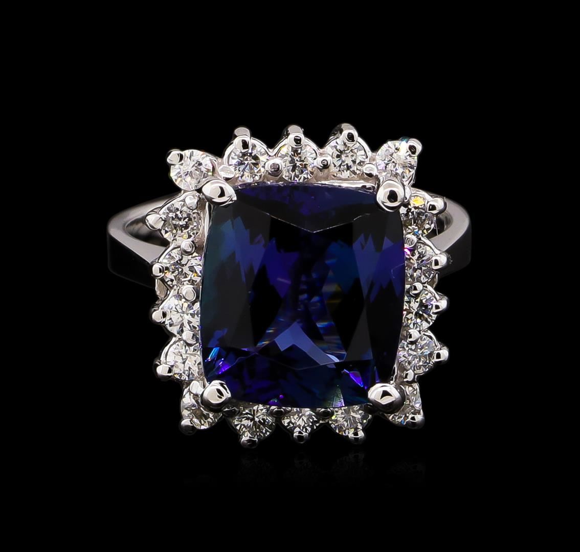 One electronically tested 14KT white gold lady's cast fashion ring with a cushion basket halo with a bright polish finish. The featured lady's ring has a shank measuring 2.94 millimeters wide. Identified with markings of "14K". Condition is new, good workmanship. Containing: One prong set rectangular cushion modified brilliant cut natural tanzanite, measuring 11.12 x 9.98 x 6.49mm, 10%. bulge factor, approximate weight of 6.25ct., clarity is eye clean, type I, medium dark, very slightly grayish, violetish blue color, (GIA vB 6/3), cut is very good. Transmitting light with no distortion, transparent. Colored gemstones are presumed to have been subjected to commonly used enhancement processes. Graded in the setting. Eighteen prong set round brilliant cut diamonds, measuring 2.05 - 1.95 x 1.24mm (depth est.) approximate total weight of 18 Stones = 0.55ct. Graded in the setting. Clarity: VS-2 to SI-2. Color: G - I. Cut Very Good. Total Weight of Colored Stones 6.25ct. Total Weight of Diamonds 0.55ct. Total Weight of Ring 6.60gm. GAS Appraised at $12,495.00.