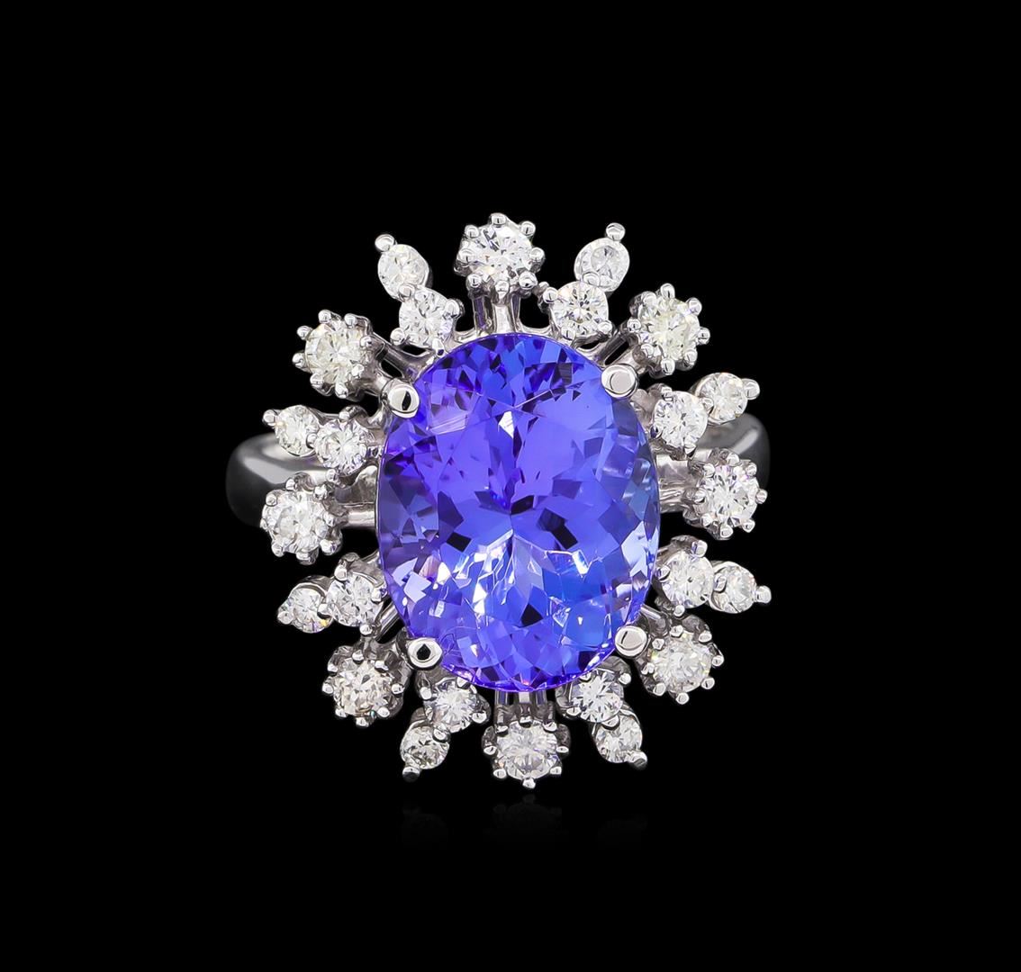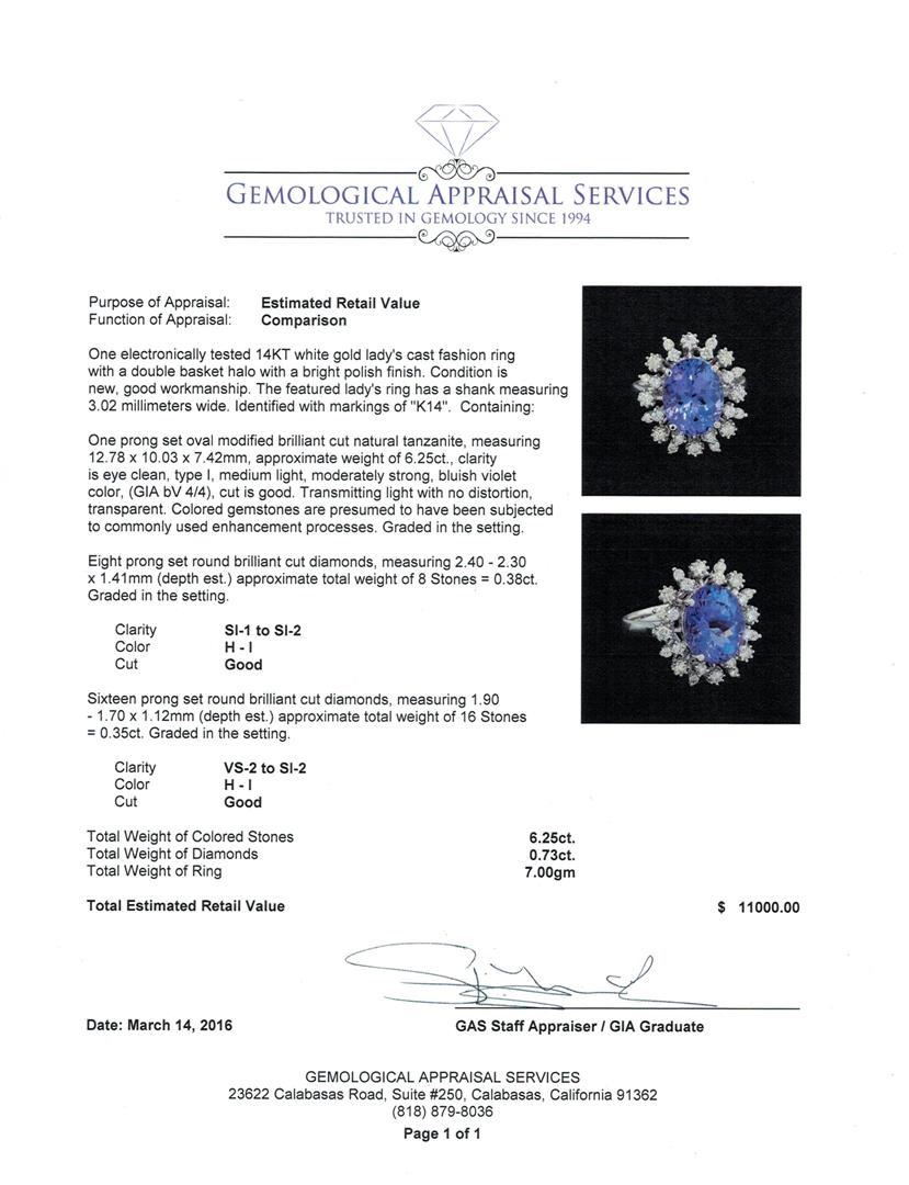 One electronically tested 14KT white gold lady's cast fashion ring with a double basket halo with a bright polish finish. The featured lady's ring has a shank measuring 3.02 millimeters wide. Identified with markings of "K14". Condition is new, good workmanship. Containing: One prong set oval modified brilliant cut natural tanzanite, measuring 12.78 x 10.03 x 7.42mm, approximate weight of 6.25ct., clarity is eye clean, type I, medium light, moderately strong, bluish violet color, (GIA bV 4/4), cut is good. Transmitting light with no distortion, transparent. Colored gemstones are presumed to have been subjected to commonly used enhancement processes. Graded in the setting. Eight prong set round brilliant cut diamonds, measuring 2.40 - 2.30 x 1.41mm (depth est.) approximate total weight of 8 Stones = 0.38ct. Graded in the setting. Clarity: SI-1 to SI-2. Color: H - I. Cut Good Sixteen prong set round brilliant cut diamonds, measuring 1.90 - 1.70 x 1.12mm (depth est.) approximate total weight of 16 Stones = 0.35ct. Graded in the setting. Clarity: VS-2 to SI-2. Color: H - I. Cut Good. Total Weight of Colored Stones 6.25ct. Total Weight of Diamonds 0.73ct. Total Weight of Ring 7.00gm. GAS Appraised at $11,000.00.