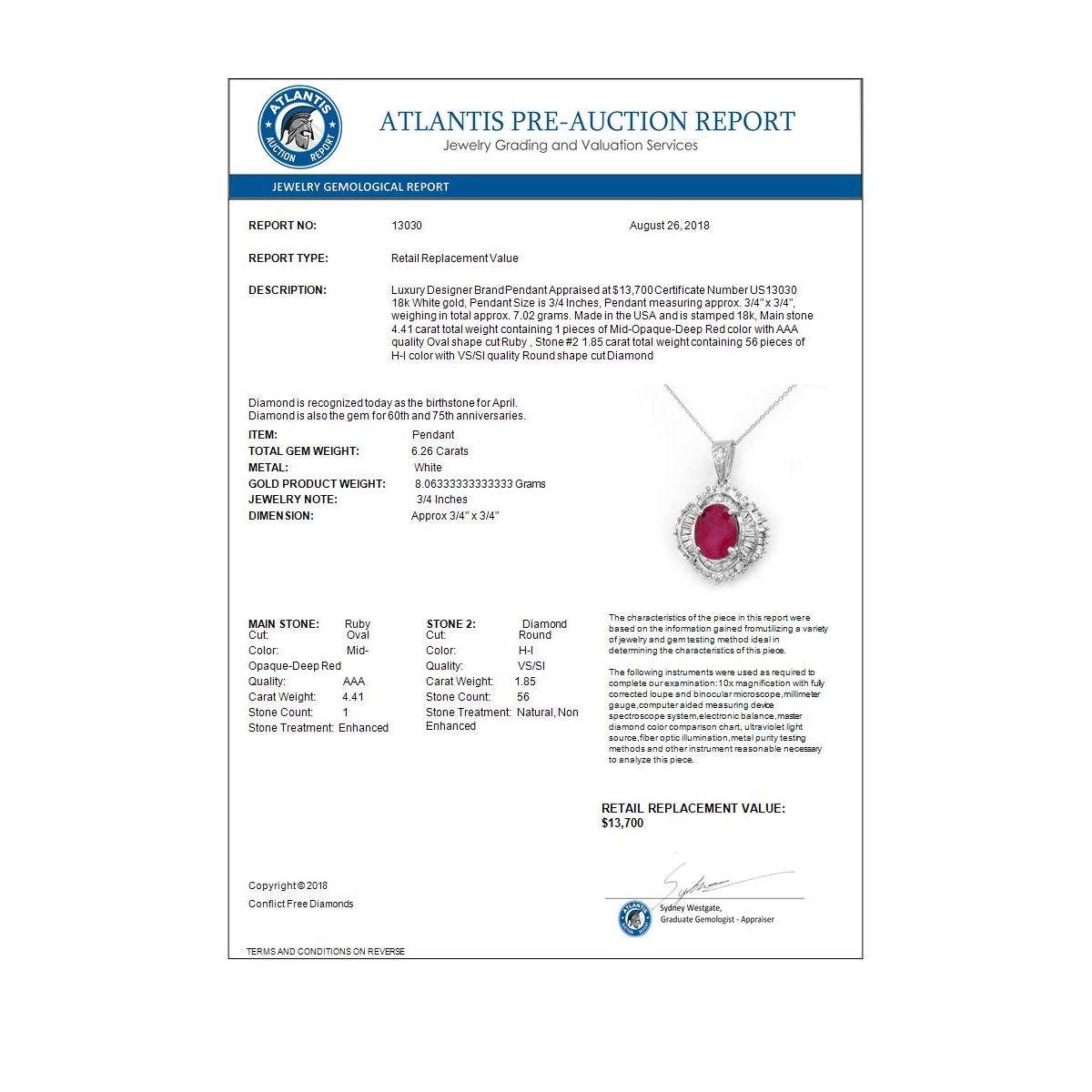 REF-178W2F -13030 ---- 6.26 CTW Ruby & Diamond Pendant 18K White Gold ---- Luxury Designer Brand Pendant Appraised at $13,700 Certificate Number US13030 18k White gold, Pendant Size is 3/4 Inches, Pendant measuring approx. 3/4" x 3/4", weighing in total approx. 7.02 grams. Made in the USA and is stamped 18k, Main stone 4.41 carat total weight containing 1 pieces of Mid-Opaque-Deep Red color with AAA quality Oval shape cut Ruby , Stone #2 1.85 carat total weight containing 56 pieces of H-I color with VS/SI quality Round shape cut Diamond
