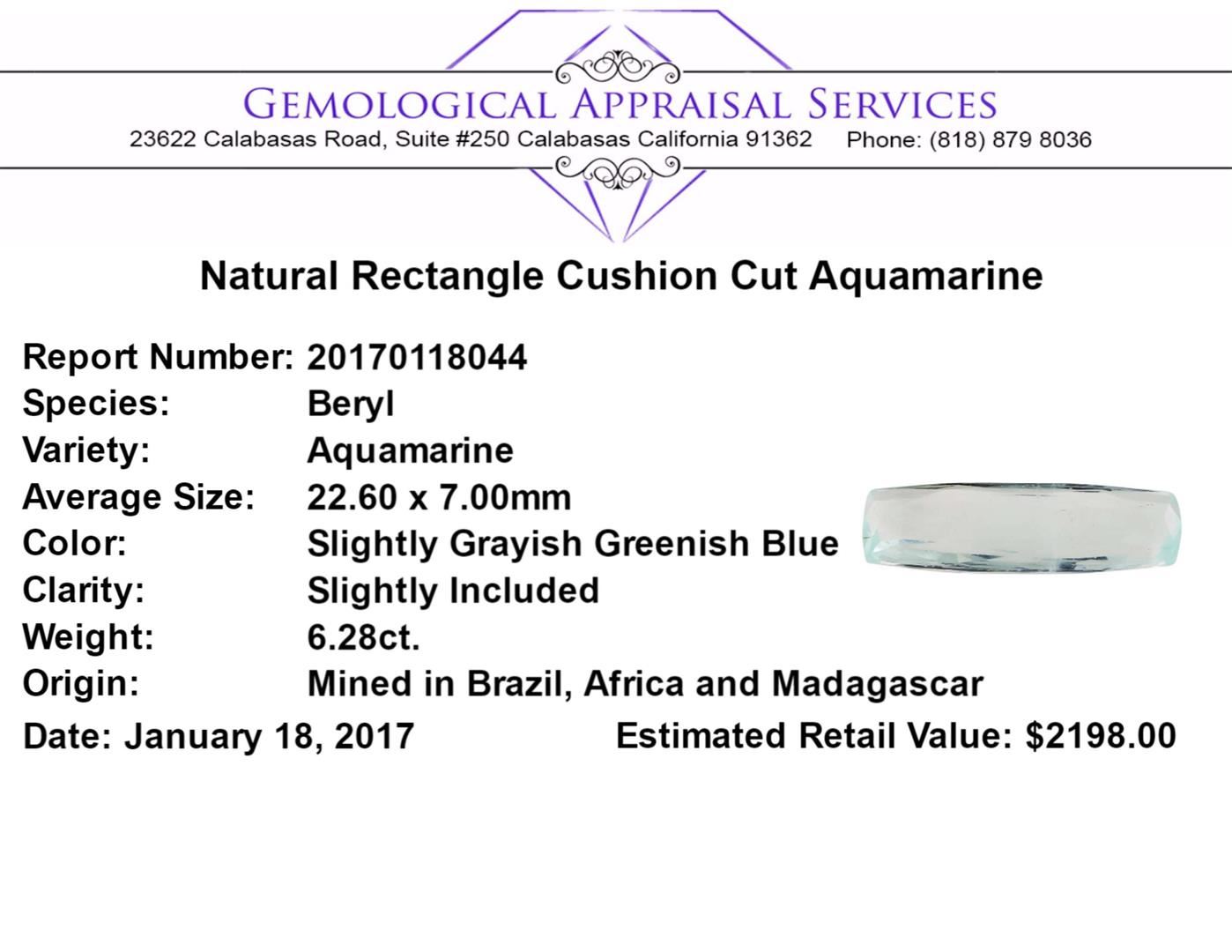 One natural rectangle cushion cut aquamarine with an exact weight of 6.28ct., clarity is slightly included, slightly grayish greenish blue. Gemological Appraisals Services estimates the retail value at $2198 GAS Appraised.