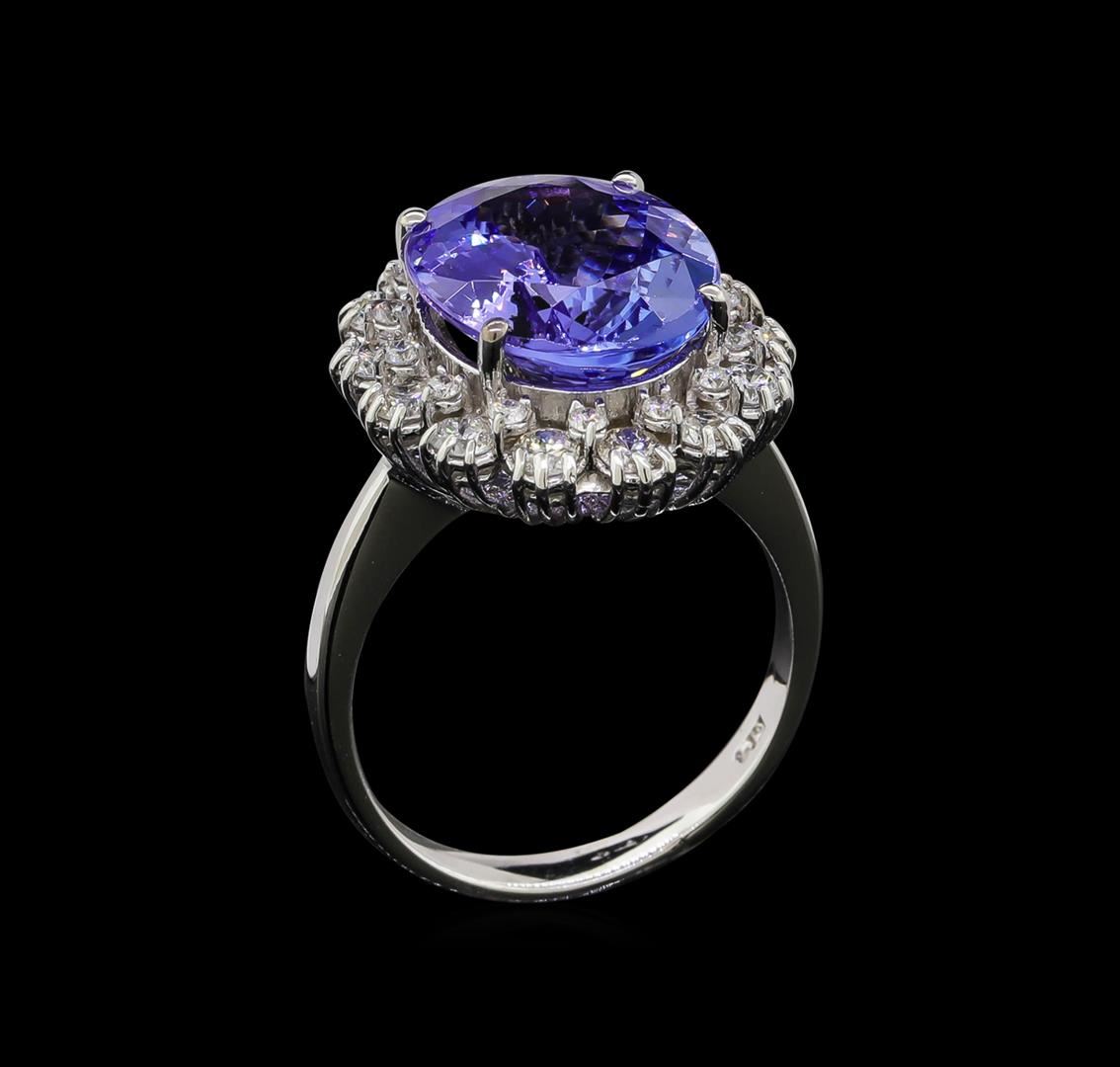 One electronically tested 14KT white gold lady's cast fashion ring with a double basket halo with a bright polish finish. The featured lady's ring has a shank measuring 2.85 millimeters wide. Identified with markings of 'K14'. Condition is new, good workmanship. Containing: One prong set oval modified brilliant cut natural tanzanite, measuring 13.82 x 11.19 x 5.60mm, (depth est.) 3%. bulge factor, approximate weight of 6.28ct., clarity is eye clean, medium, moderately strong, bluish violet color, (GIA bV 5/4), cut is very good. Transmitting light with no distortion, transparent. Colored gemstones are presumed to have been subjected to commonly used enhancement processes. Graded in the setting. Fourteen prong set round brilliant cut diamonds, measuring 2.50 - 2.40 x 1.52mm (depth est.) approximate total weight of 14 Stones = 0.78ct. Graded in the setting. Clarity SI-1 to I-1. Color: H - I Cut Good Fourteen prong set round brilliant cut diamonds, measuring 1.55 - 1.45 x 0.93mm (depth est.) approximate total weight of 14 Stones = 0.18ct. Graded in the setting. Clarity SI-1 to SI-2. Color: H - I Cut Good. Total Weight of Colored Stones 6.28ct.. Total Weight of Diamonds 0.96ct.. Total Weight of Ring 6.30gm GAS Appraised at $12,700.00.