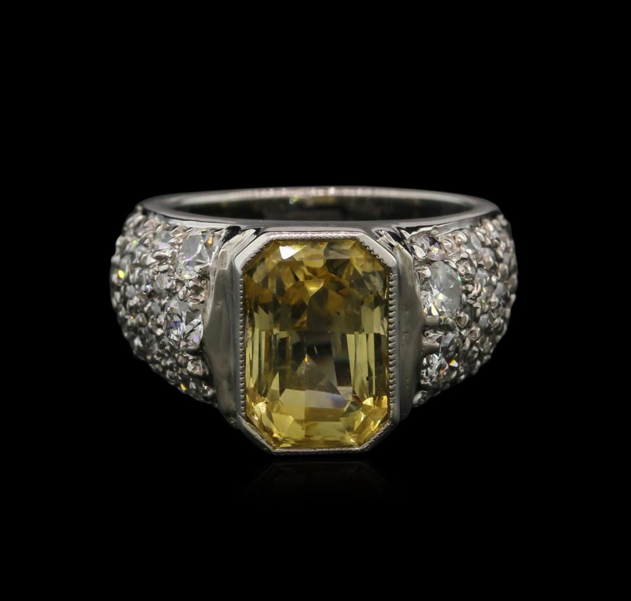 One electronically tested platinum ladies cast sapphire and diamond ring with a bright polish finish. Condition is new. Containing: One bezel set radiant modified brilliant cut natural yellow sapphire, measuring 10.70 x 7.50 x 6.00mm, approximate weight of 6.28ct., clarity is eye clean, light, brownish, yellow color, (GIA Y 3/3), cut is very good. Thirty-Four prong set round brilliant cut diamonds, measuring 3.00 - 1.80 x 1.44mm (depth est.) approximate total weight of 34 Stones = 1.00ct. Clarity: SI-1 to SI-2. Color: K - L, Cut is Good. Colored gemstones are presumed to have been subjected to commonly used enhancement processes. All diamonds and colored gemstones are graded in the mounting, unless otherwise stated. Total Weight of Colored Stones 6.28ct. Total Weight of Diamonds 1.00ct. Total Weight of Ring 9.90 grams. GGL Appraised.