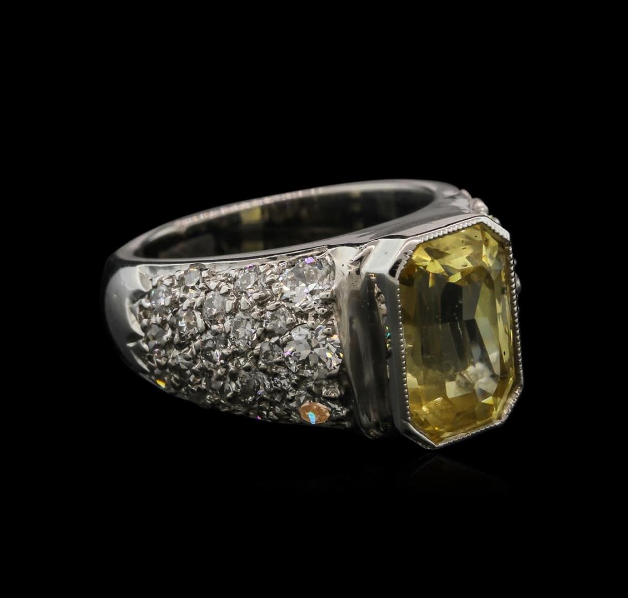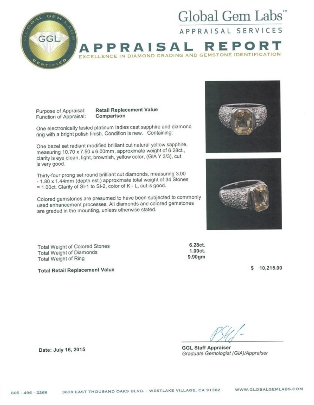 One electronically tested platinum ladies cast sapphire and diamond ring with a bright polish finish. Condition is new. Containing: One bezel set radiant modified brilliant cut natural yellow sapphire, measuring 10.70 x 7.50 x 6.00mm, approximate weight of 6.28ct., clarity is eye clean, light, brownish, yellow color, (GIA Y 3/3), cut is very good. Thirty-Four prong set round brilliant cut diamonds, measuring 3.00 - 1.80 x 1.44mm (depth est.) approximate total weight of 34 Stones = 1.00ct. Clarity: SI-1 to SI-2. Color: K - L, Cut is Good. Colored gemstones are presumed to have been subjected to commonly used enhancement processes. All diamonds and colored gemstones are graded in the mounting, unless otherwise stated. Total Weight of Colored Stones 6.28ct. Total Weight of Diamonds 1.00ct. Total Weight of Ring 9.90 grams. GGL Appraised.