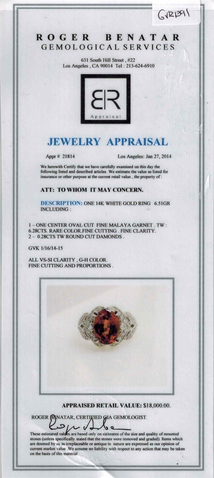 14K W/G NATURAL MALAYA GARNET RING: 6.51GM/ MALAYA GARNET :6.28CT/DIA :0.28CT/#GVR1391/MALAYA GARNET IS THE VERY RARE GARNET IN THE GARNET FAMILY. VERY HARD TO FIND THIS KIND OF COLOR AND QULAITY