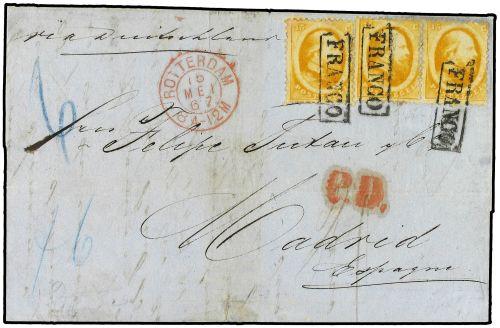 6(3) 1867 ROTTERDAM a MADRID. 15 cts. amarillo (3). Magnifica y rara circulada a España. Cert. N.V.P.H.