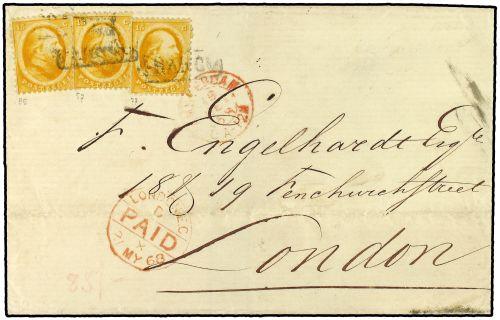6(3) 1868 AMSTERDAM a LONDRES. 15 cts. amarillo (3). MAGNIFICA.