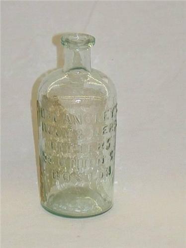 6 3/4" AQUA BOTTLE EMBOSSED DR. LANGLEY'S ROOT and HERB BITTERS, 99 UNION ST. BOSTON W/ PARTIAL LABEL - LOSSES TO LABEL;