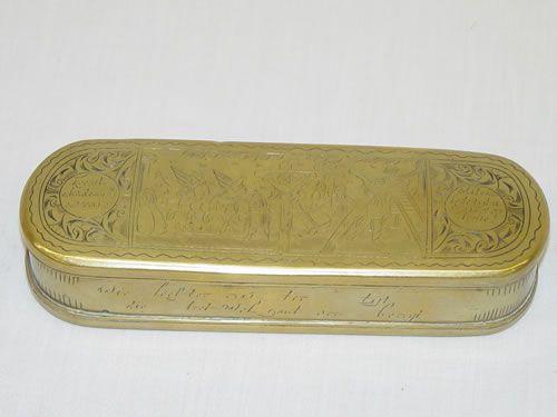 6 3/4" EARLY DUTCH BRASS TOBACCO BOX W/ CRUCIFIXION SCENE - NORMAL WEAR