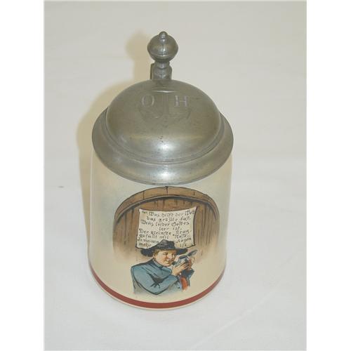 6 3/4" GERMAN POTTERY STEIN W/ PEWTER LID W/ D.H. & ANCHOR-DECORATED W/ DRINKER OUTSIDE OF TAVERN DOOR W/ BROADSIDE, HALLMARKED - WEAR & IMPERFECTIONS;