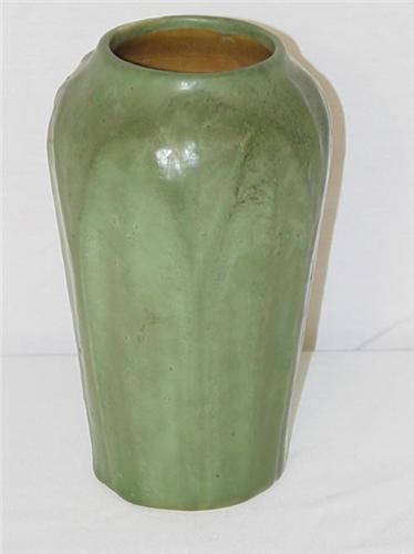 6 3/4" HAMPSHIRE POTTERY MATTE GREEN VASE W/ EMBOSSED LEAF DECORATION & ALTERNATING STEMMED FLOWER BUDS- MARKED ON BASE HAMPSHIRE POTTERY W/ "M" IN CIRCLE - SEVERAL SMALL BUBBLE BURSTS IN GLAZE
