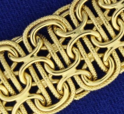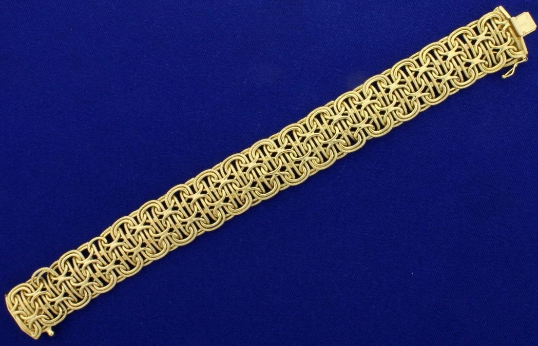 In 14k yellow gold. 16.95mm wide with safety clasp. 11.2g.