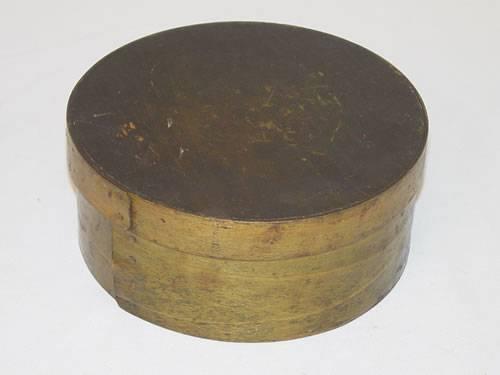 6 3/4" ROUND PANTRY BOX W/ COPPER NAILS & TRACES OF GREEN PAINT - WEAR & IMPERFECTIONS;