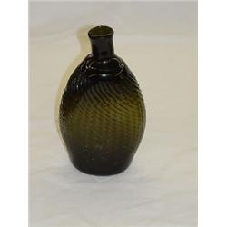 6 3/8" PITKIN W/ 36 RIB & BROKEN SWIRL PINT FLASK,OLIVE GREEN W/ OPEN PONTIL