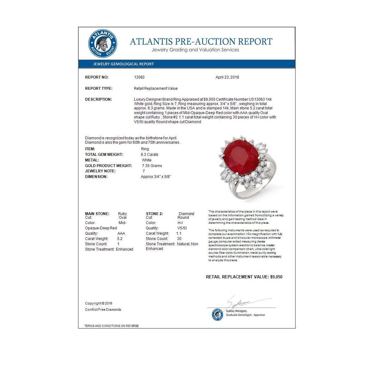 REF-117T3M -13063 ---- 6.30 CTW Ruby & Diamond Ring 14K White Gold ---- Luxury Designer Brand Ring Appraised at $9,050 Certificate Number US13063 14k White gold, Ring Size is 7, Ring measuring approx. 3/4" x 5/8" , weighing in total approx. 6.3 grams. Made in the USA and is stamped 14k, Main stone 5.2 carat total weight containing 1 pieces of Mid-Opaque-Deep Red color with AAA quality Oval shape cut Ruby , Stone #2 1.1 carat total weight containing 30 pieces of H-I color with VS/SI quality Round shape cut Diamond