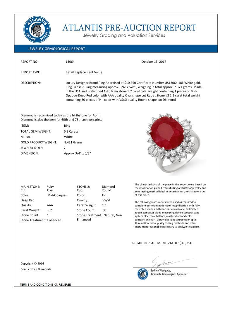 REF-134N4Y -13064 ---- 6.30 CTW Ruby & Diamond Ring 18K White Gold ---- Luxury Designer Brand Ring Appraised at $10,350 Certificate Number US13064 18k White gold, Ring Size is 7, Ring measuring approx. 3/4" x 5/8" , weighing in total approx. 7.371 grams. Made in the USA and is stamped 18k, Main stone 5.2 carat total weight containing 1 pieces of Mid-Opaque-Deep Red color with AAA quality Oval shape cut Ruby , Stone #2 1.1 carat total weight containing 30 pieces of H-I color with VS/SI quality Round shape cut Diamond