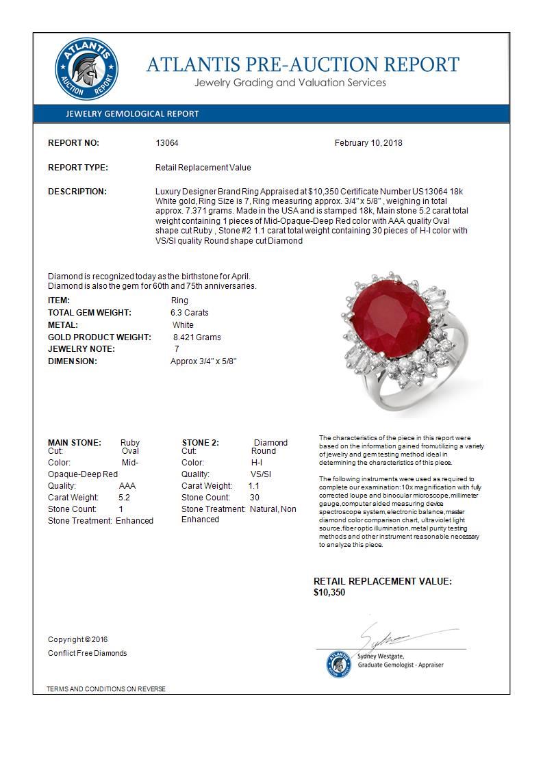 REF-134N4Y -13064 ---- 6.30 CTW Ruby & Diamond Ring 18K White Gold ---- Luxury Designer Brand Ring Appraised at $10,350 Certificate Number US13064 18k White gold, Ring Size is 7, Ring measuring approx. 3/4" x 5/8" , weighing in total approx. 7.371 grams. Made in the USA and is stamped 18k, Main stone 5.2 carat total weight containing 1 pieces of Mid-Opaque-Deep Red color with AAA quality Oval shape cut Ruby , Stone #2 1.1 carat total weight containing 30 pieces of H-I color with VS/SI quality Round shape cut Diamond