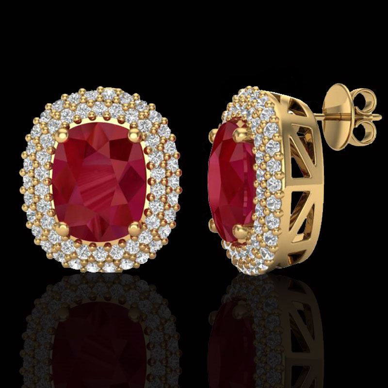 REF-160X9T -20125 ---- 6.30 CTW Ruby & Micro Pave VS/SI Diamond Halo Earrings 18K Yellow Gold ---- Luxury Designer Brand Earring Appraised at $12,400 Certificate Number US20125 18k Yellow gold, Earring Size is 9/16 Inches, Earring measuring approx. 1/2" X 9/16" , weighing in total approx. 8 grams. Made in the USA and is stamped 18k, Main stone 5.3 carat total weight containing 2 pieces of Mid-Opaque-Deep Red color with AAA quality Cushion shape cut Ruby , Stone #2 1 carat total weight containing 116 pieces of H-I color with VS/SI quality Round shape cut Diamond
