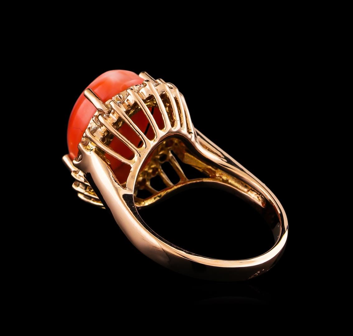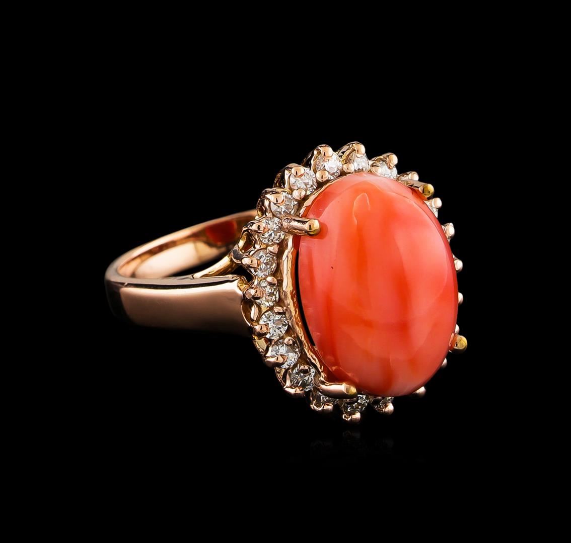 One ring featuring: 14KT rose gold weighing 6.20 grams containing one coral with a total weight of 6.30 and side diamonds with a total weight of 0.46ct.