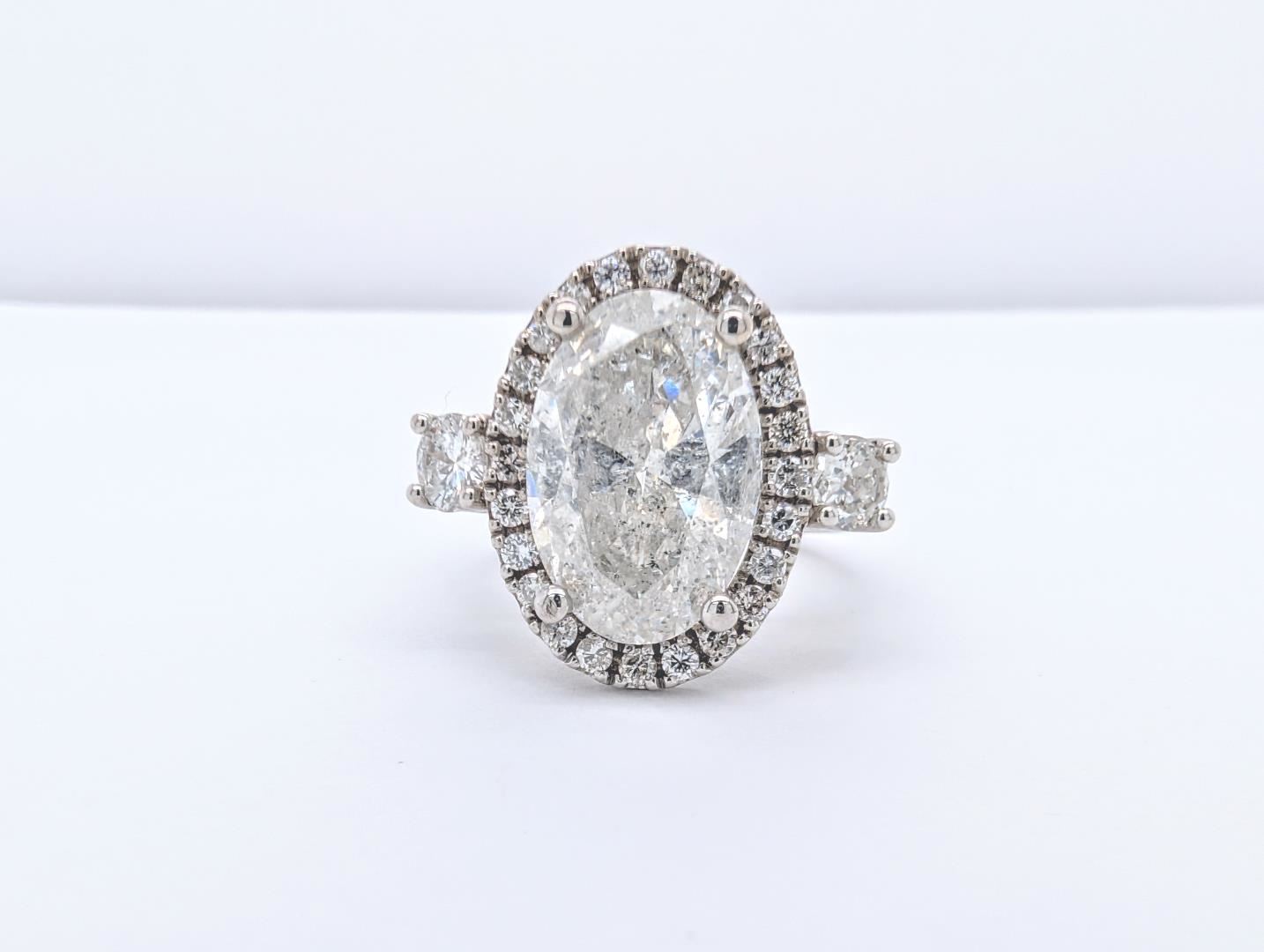 One electronically tested 14KT white gold lady's custom CAD/CAM fashion oval halo ring with a cathedral basket motif with a bright polish finish. The featured lady's ring has a shank measuring 3.60 millimeters in width. Identified with markings of "14K". Condition is new. Containing: One prong set oval shaped cut diamond, measuring 14.15 x 9.52 x 5.62mm (depth est.) , 3.00% GTCF approximate weight of 5.01ct. Graded in the setting. Color H Clarity I-2 Cut Very Good Two prong set round brilliant cut diamonds, measuring 4.14 - 3.97 x 2.52mm (depth est.) approximate total weight of 2 Stones = 0.51ct. Graded in the setting. Color H Clarity SI-2 Cut Good Twenty-Four prong set round brilliant cut diamonds, measuring 1.74 - 1.68 x 1.06mm (depth est.) approximate total weight of 24 Stones = 0.48ct. Graded in the setting. Color H - J Clarity SI-1 to SI-3 Cut Good Twenty-Four prong set round brilliant cut diamonds, measuring 1.50 - 1.45 x 0.93mm (depth est.) approximate total weight of 24 Stones = 0.30ct. Graded in the setting. Color H - I Clarity SI-1 to SI-3 Cut Good Total Weight of Diamonds 6.30ct. Total Weight of Ring 7.80gm Estimated Retail Value $ 68400.00