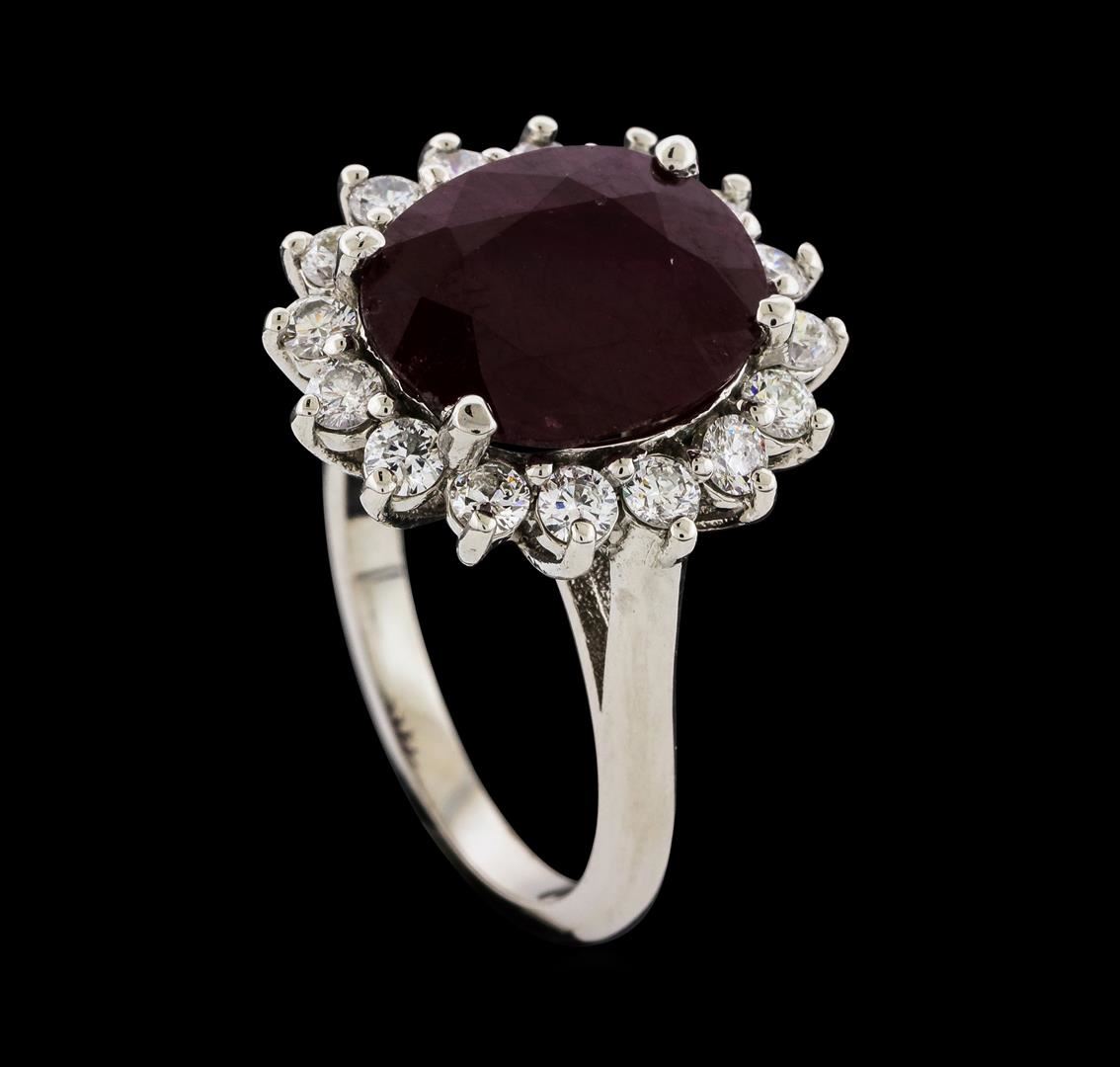 One Ruby and Diamond Ring featuring: 14KT White Gold with a total weight of 6.50 grams, One Ruby stone with a total weight of 6.30ct, and 22 Diamonds with a total weight of 0.56ctw.