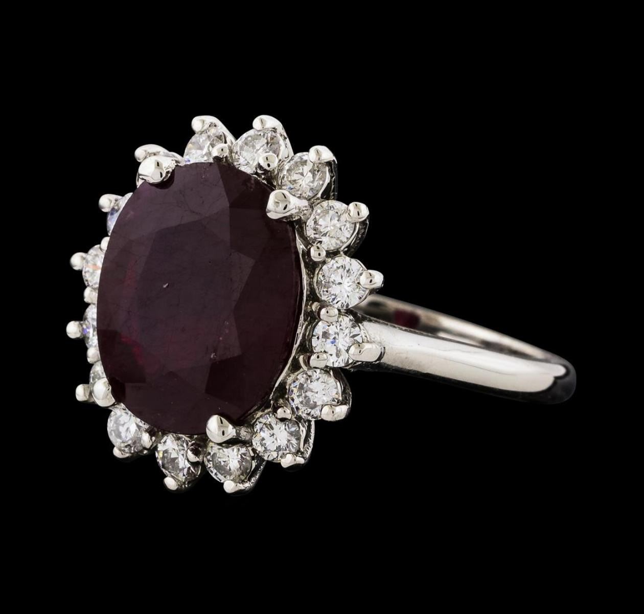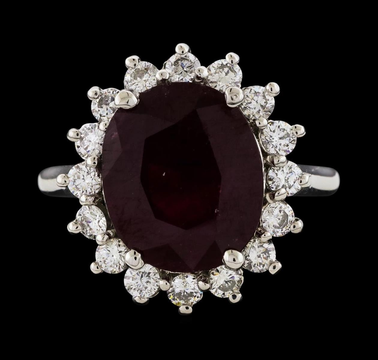 One Ruby and Diamond Ring featuring: 14KT White Gold with a total weight of 6.50 grams, One Ruby stone with a total weight of 6.30ct, and 22 Diamonds with a total weight of 0.56ctw.