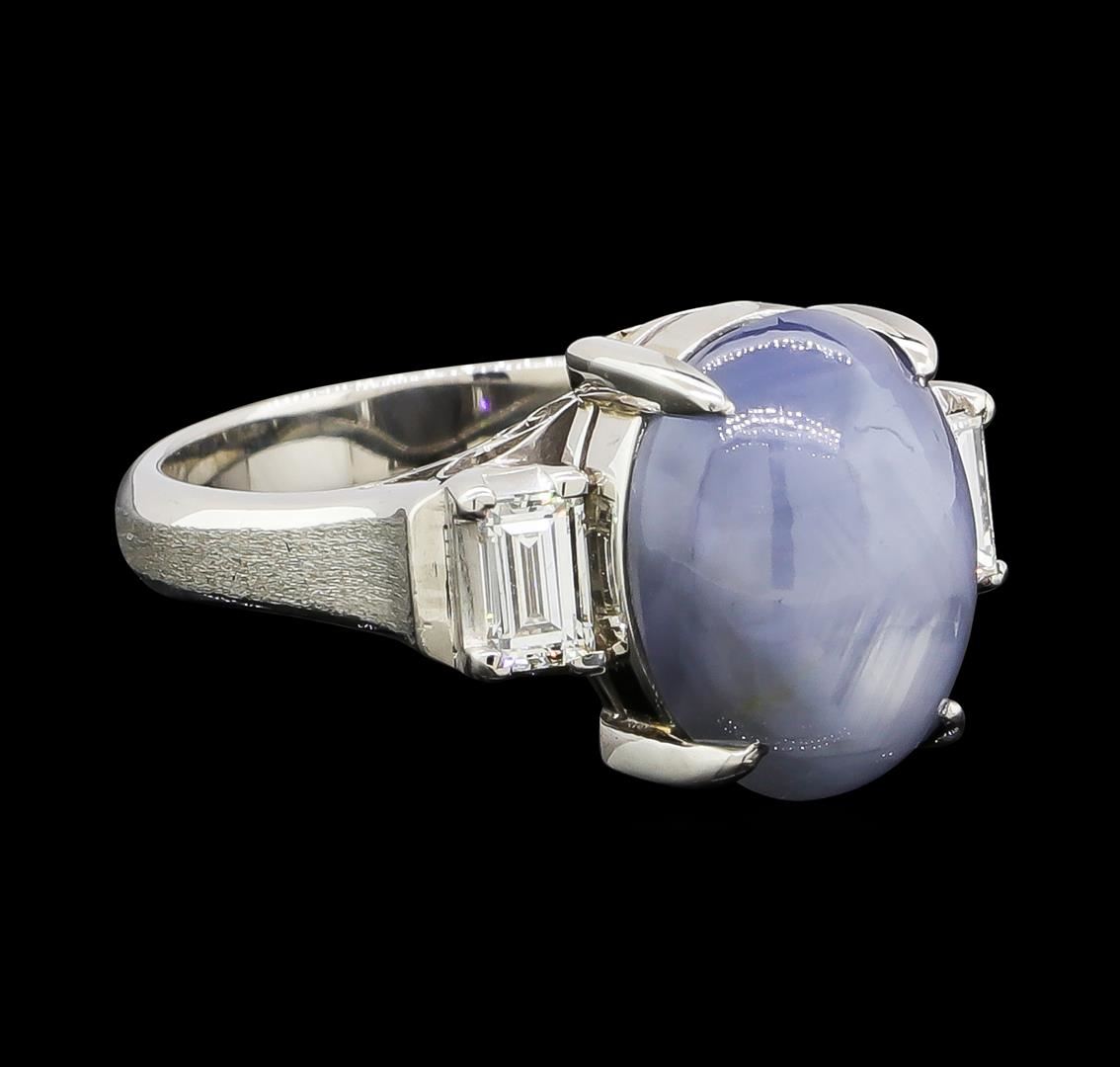 One ring featuring: Platinum containing Star Sapphire with a total weight of 6.30ct and Diamonds with a total weight of 0.35ct. Total Weight of Ring: 7.1 grams.