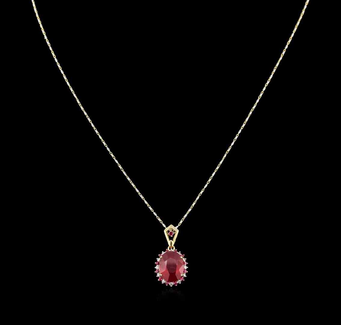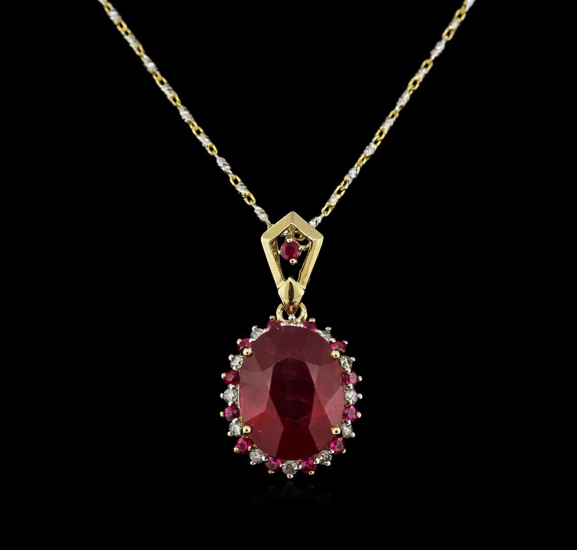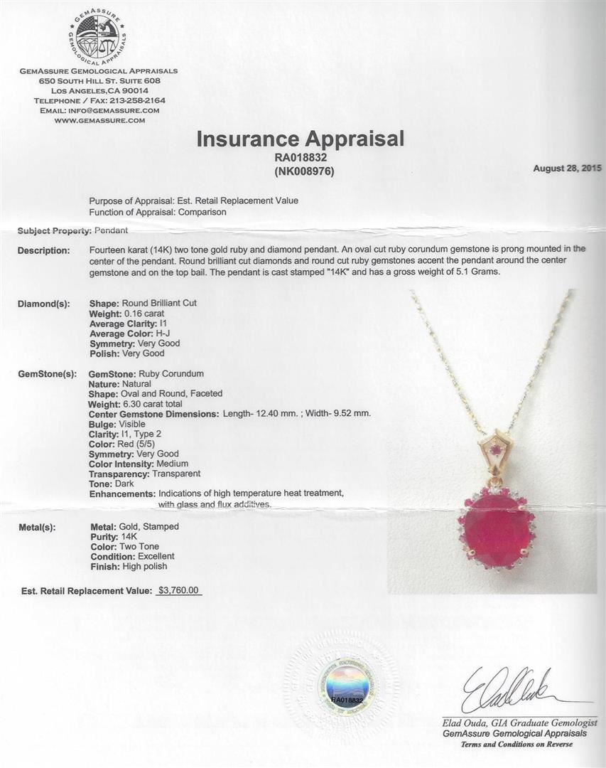 Fourteen karat (14K) two tone gold ruby and diamond pendant. An oval cut ruby corundum gemstone is prong mounted in the center of the pendant. Round brilliant cut diamonds and round cut ruby gemstones accent the pendant around the center gemstone and on the top bail. The pendant is cast stamped "14K" and ha a gross weight of 5.1 Grams. Diamond(s): Shape: Round Brilliant Cut. Weight: 0.16 carat. Average Clarity: I1. Average Color: H-J. Symmetry: Very Good. Polish: Very Good. Gemstone(s): Gemstone: Ruby Corundum. Nature: Natural. Shape: Oval and Round, Faceted. Weight: 6.30 carat total. Center Gemstone Dimensions: Length- 12.40 mm. ; Width- 9.52 mm. Bulge: Visible. Clarity: I1, Type 2. Color: Red (5/5). Symmetry: Very Good. Color Intensity: Medium. Transparency: Transparent. Tone: Dark. Enhancements: Indications of high temperature heat treatment, with glass and flux additives. Metal(s): Metal: Gold, Stamped. Purity: 14K. Color: Two Tone. Condition: Excellent. Finish: High polish. GGA Appraised at $3,760.00.