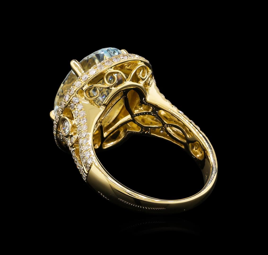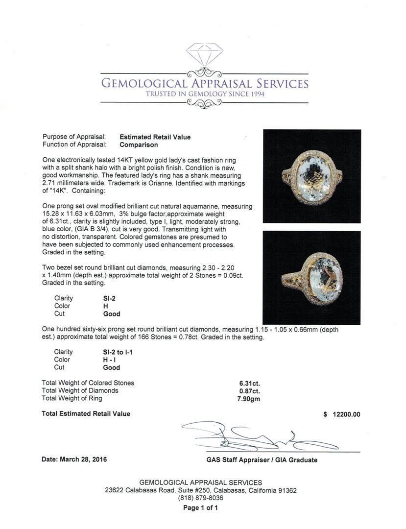 One electronically tested 14KT yellow gold lady's cast fashion ring with a split shank halo with a bright polish finish. The featured lady's ring has a shank measuring 2.71 millimeters wide. Trademark is Orianne. Identified with markings of "14K". Condition is new, good workmanship. Containing: One prong set oval modified brilliant cut natural aquamarine, measuring 15.28 x 11.63 x 6.03mm, 3%. bulge factor, approximate weight of 6.31ct., clarity is slightly included, type I, light, moderately strong, blue color, (GIA B 3/4), cut is very good. Transmitting light with no distortion, transparent. Colored gemstones are presumed to have been subjected to commonly used enhancement processes. Graded in the setting. Two bezel set round brilliant cut diamonds, measuring 2.30 - 2.20 x 1.40mm (depth est.) approximate total weight of 2 Stones = 0.09ct. Graded in the setting. Clarity: SI-2. Color: Good One Hundred Sixty-Six prong set round brilliant cut diamonds, measuring 1.15 - 1.05 x 0.66mm (depth est.) approximate total weight of 166 Stones = 0.78ct. Graded in the setting. Clarity: SI-2 to I-1. Color: H - I. Cut Good. Total Weight of Colored Stones 6.31ct. Total Weight of Diamonds 0.87ct. Total Weight of Ring 7.90gm. GAS Appraised at $12,200.00.