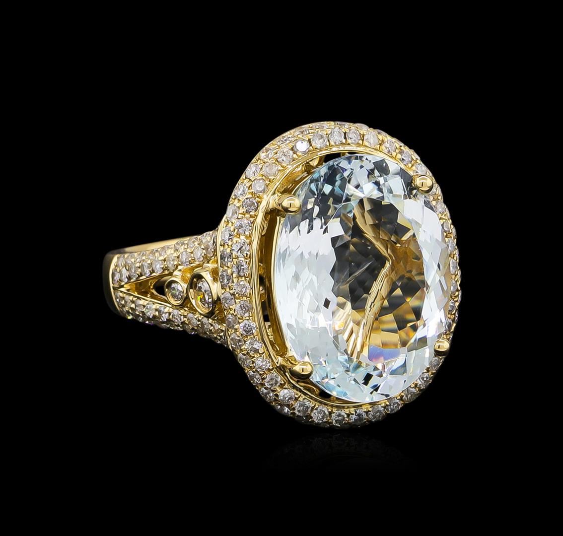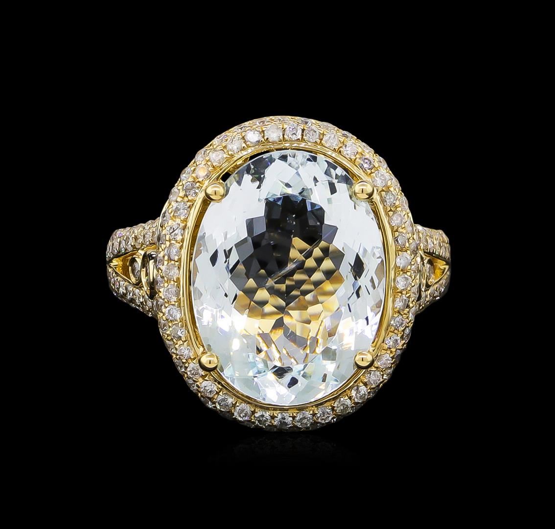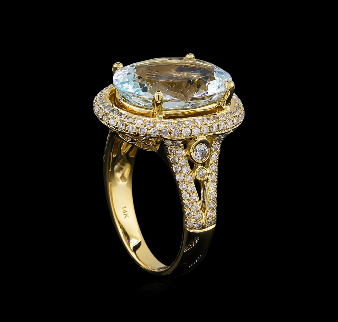 One electronically tested 14KT yellow gold lady's cast fashion ring with a split shank halo with a bright polish finish. The featured lady's ring has a shank measuring 2.71 millimeters wide. Trademark is Orianne. Identified with markings of "14K". Condition is new, good workmanship. Containing: One prong set oval modified brilliant cut natural aquamarine, measuring 15.28 x 11.63 x 6.03mm, 3%. bulge factor, approximate weight of 6.31ct., clarity is slightly included, type I, light, moderately strong, blue color, (GIA B 3/4), cut is very good. Transmitting light with no distortion, transparent. Colored gemstones are presumed to have been subjected to commonly used enhancement processes. Graded in the setting. Two bezel set round brilliant cut diamonds, measuring 2.30 - 2.20 x 1.40mm (depth est.) approximate total weight of 2 Stones = 0.09ct. Graded in the setting. Clarity: SI-2. Color: Good One Hundred Sixty-Six prong set round brilliant cut diamonds, measuring 1.15 - 1.05 x 0.66mm (depth est.) approximate total weight of 166 Stones = 0.78ct. Graded in the setting. Clarity: SI-2 to I-1. Color: H - I. Cut Good. Total Weight of Colored Stones 6.31ct. Total Weight of Diamonds 0.87ct. Total Weight of Ring 7.90gm. GAS Appraised at $12,200.00.