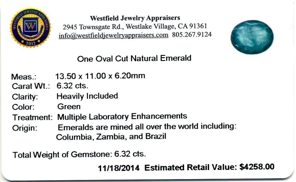 6.32ct. One Oval Cut Natural Emerald Westfield Appraised at $4,258.00.