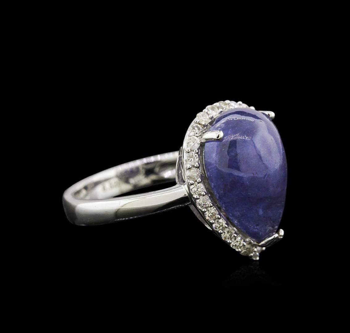 One electronically tested white gold ladies cast tanzanite and diamond ring with a bright polish finish. Condition is new, good workmanship. The featured tanzanite is set within a diamond bezel supported by tapering shoulders, completed by a three millimeter wide band. Trademark is Orianne. Identified with markings of" 14K". Containing: One prong set pear cabochon cut natural tanzanite, measuring 14.00 x 10.00 x 6.10mm, approximate weight of6.32ct., clarity is heavily included, type I, medium dark, very slightly grayish, bluish violet color, (GIA bV 6/3),cut is good. Transmitting light with some distortion, transparent to translucent. Graded in the setting. Tanzanite is a very rare gemstone that is only found in the country of Tanzania. Originally discovered in 1967.Tiffany & Company, named the stone Tanzanite. It is found in the Usumbura Mountains that border the UmbaValley of northern Tanzania. Tanzanite occurs in gray, brown, violet, blue, reddish-purple, & green. The gem is interesting because of its exceptional pleochroism. Rotated in different directions a tanzanite will exhibit multiple changes of color. Tanzanite has a low tolerance to ultrasonic cleaning, and should not be cleaned using this method. Twenty-seven prong set round brilliant cut diamonds, measuring 1.40 - 1.30 x 0.81mm (depth est.) approximate total weight of 27 Stones = 0.27ct. Graded in the setting. Clarity: 1-1 to 1-2.Color: H - J. AIG Appraised at $5,850.00.