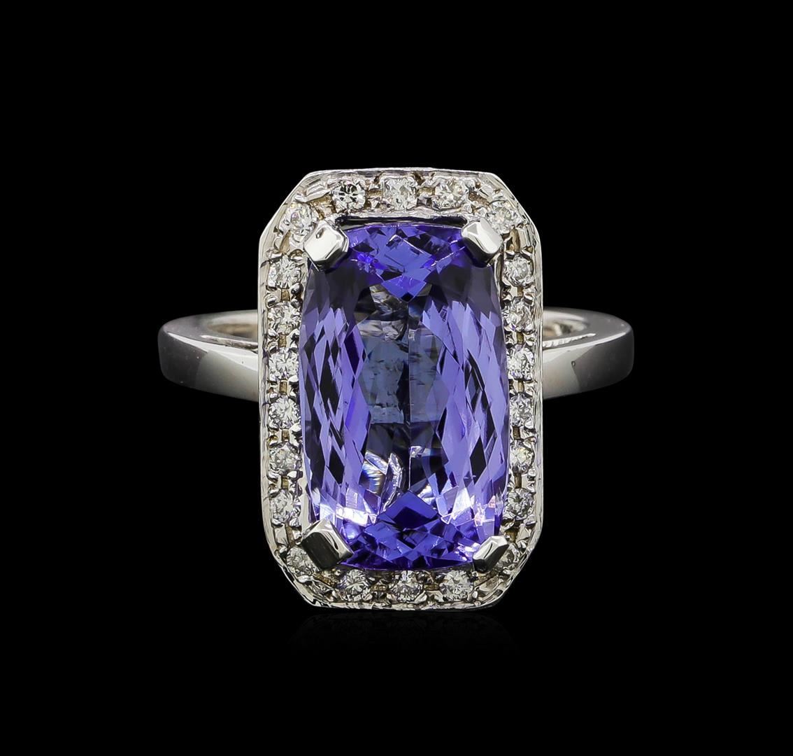 One electronically tested 14KT white gold lady's cast fashion ring with a cathedral shank with a halo with a bright polish finish. The featured lady's ring has a shank measuring 2.10 millimeters wide. Identified with markings of '14K'. Condition is new, good workmanship. Containing: One prong set rectangular cushion modified brilliant cut natural tanzanite, measuring 14.74 x 8.75 x 5.90mm, (depth est.) 5%. bulge factor, approximate weight of 6.32ct., clarity is eye clean, medium light, moderately strong, violet color, (GIA V 4/4), cut is very good. Transmitting light with no distortion, transparent. Colored gemstones are presumed to have been subjected to commonly used enhancement processes. Graded in the setting. Twenty-Two bead set round brilliant cut diamonds, measuring 1.50 - 1.40 x 0.90mm (depth est.) approximate total weight of 22 Stones = 0.25ct. Graded in the setting. Clarity SI-1 to I-1. Color: H - I Cut Good. Total Weight of Colored Stones 6.32ct.. Total Weight of Diamonds 0.25ct.. Total Weight of Ring 7.20gm GAS Appraised at $9,025.00.