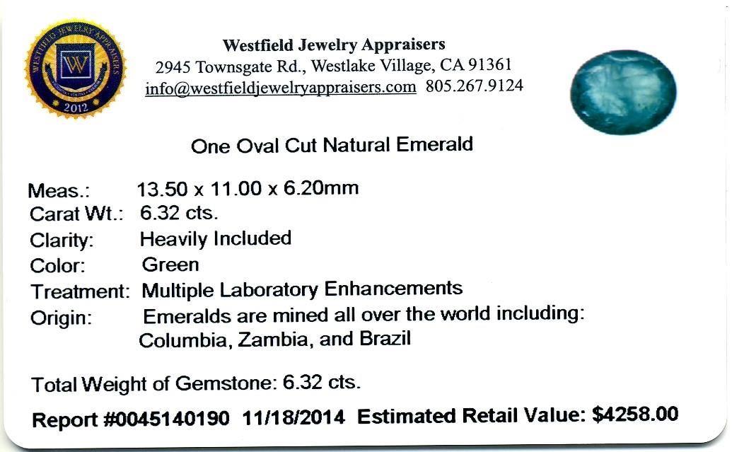 6.32ct. One Oval Cut Natural Emerald Westfield Appraised at $4,258.00.