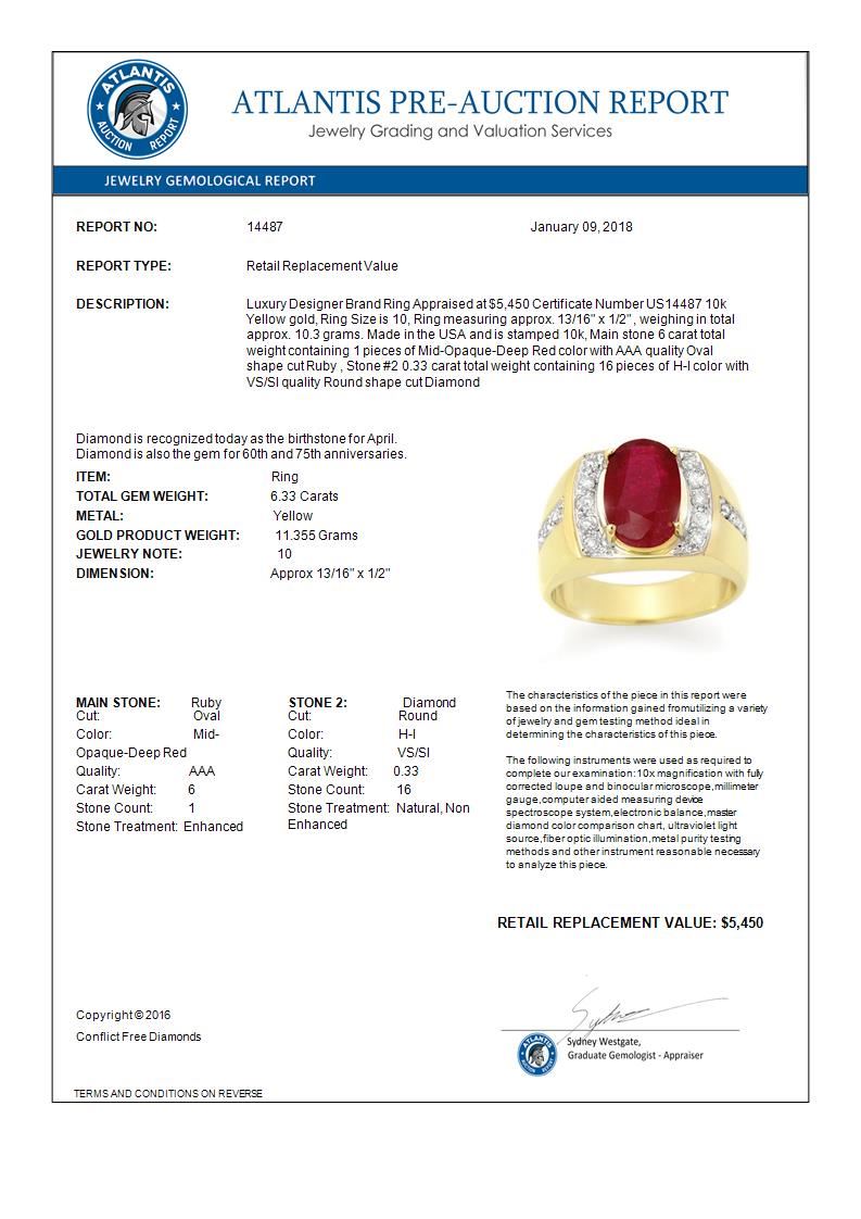 REF-76F2N -14487 ---- 6.33 CTW Ruby & Diamond Men's Ring 10K Yellow Gold ---- Luxury Designer Brand Ring Appraised at $5,450 Certificate Number US14487 10k Yellow gold, Ring Size is 10, Ring measuring approx. 13/16" x 1/2" , weighing in total approx. 10.3 grams. Made in the USA and is stamped 10k, Main stone 6 carat total weight containing 1 pieces of Mid-Opaque-Deep Red color with AAA quality Oval shape cut Ruby , Stone #2 0.33 carat total weight containing 16 pieces of H-I color with VS/SI quality Round shape cut Diamond