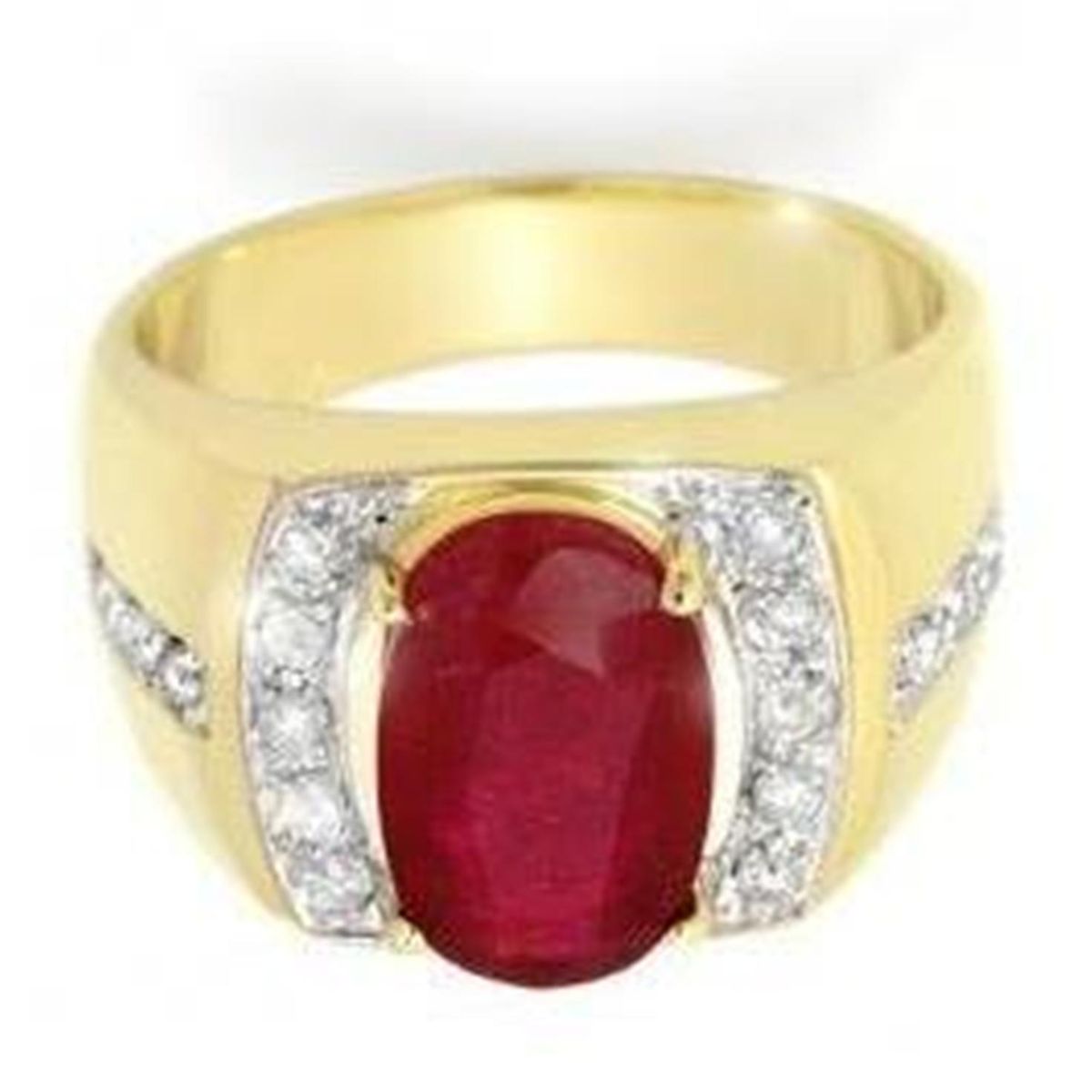 Diamond: 16 Round cut @ 0.33 ctw Clarity: SI-I Color: H-K Gemstone: Natural Ruby Gemstone color: RedGemstone quality: Good-to-Very Good Gemstone Cut & Weight: 1 Oval cut @ 6.0 ctw Metal Purity & Color : 10K Gold-Yellow Gold weight: 10.3 grams Ring size (US): 10Dimension: Approx. 13/16" x 1/2"