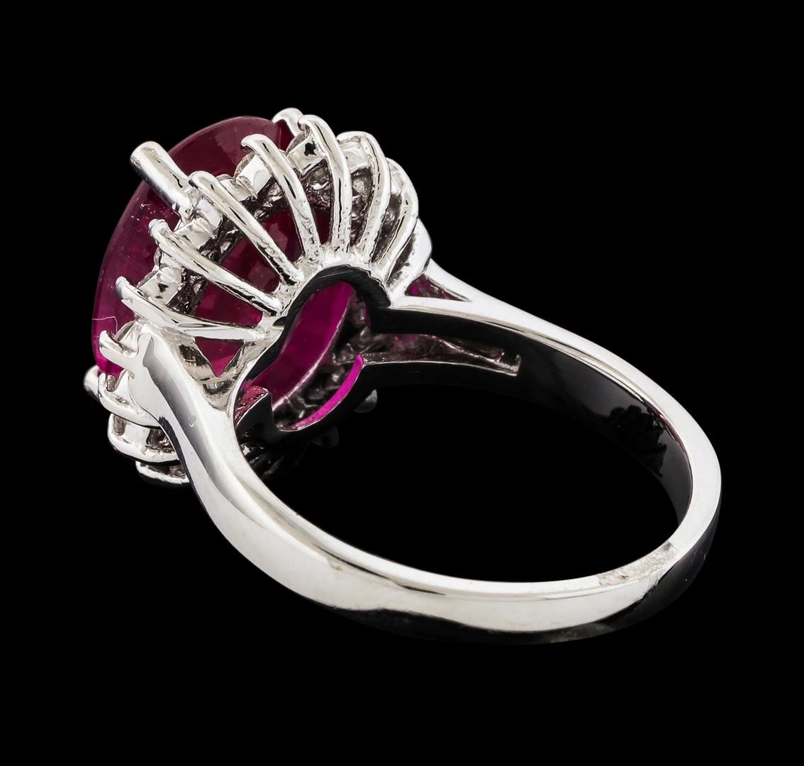 One Ruby and Diamond Ring featuring: 14KT White Gold with a total weight of 5.40 grams, One Ruby stone with a total weight of 6.33ct, and 18 Diamonds with a total weight of 0.48ctw.