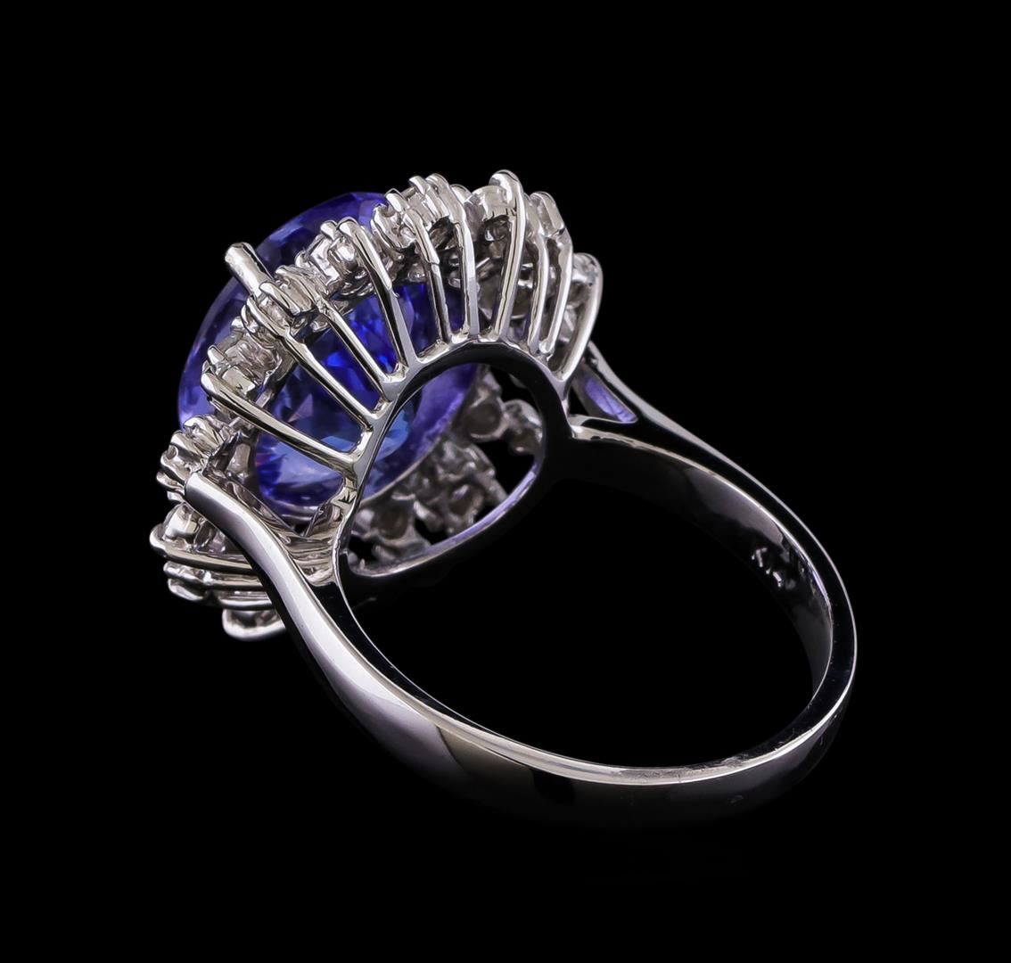 One electronically tested 14KT white gold lady's cast fashion ring with a double basket halo with a bright polish finish. The featured lady's has a shank measuring 2.70 millimeters in width. Identified with markings of "K14". Condition is new, good workmanship. Containing: One prong set oval modified brilliant cut natural tanzanite, measuring 12.90 x 10.60 x 7.35mm, (depth est.) approximate total weight of 6.33ct., clarity is eye clean, medium light, moderately strong, violetish blue color, (GIA vB 4/4), cut is very good. Transmitting light with no distortion, transparent. Colored gemstones are presumed to have been subjected to commonly used enhancement processes. Graded in the setting. Eight prong set round brilliant cut diamonds, measuring 2.00 - 1.95 x 1.23mm (depth est.) approximate total weight of 8 Stones = 0.26ct. Clarity: VS-2 to SI-1. Color: G - Very Good Eight prong set round brilliant cut diamonds, measuring 1.90 - 1.85 x 1.17mm (depth est.) approximate total weight of 8 Stones = 0.21ct. Graded in the setting. Clarity: VS-2 to SI-2. Color: G - I. Cut Good Eight prong set round brilliant cut diamonds, measuring 1.50 - 1.40 x 0.90mm (depth est.) approximate total weight of 8 Stones = 0.11ct. Graded in the setting. Clarity: SI-1 to SI-2. Color: G - Good. Total Weight of Colored Stones 6.33ct. Total Weight of Diamonds 0.58ct. Total Weight of Ring 6.70gm. GAS Appraised.