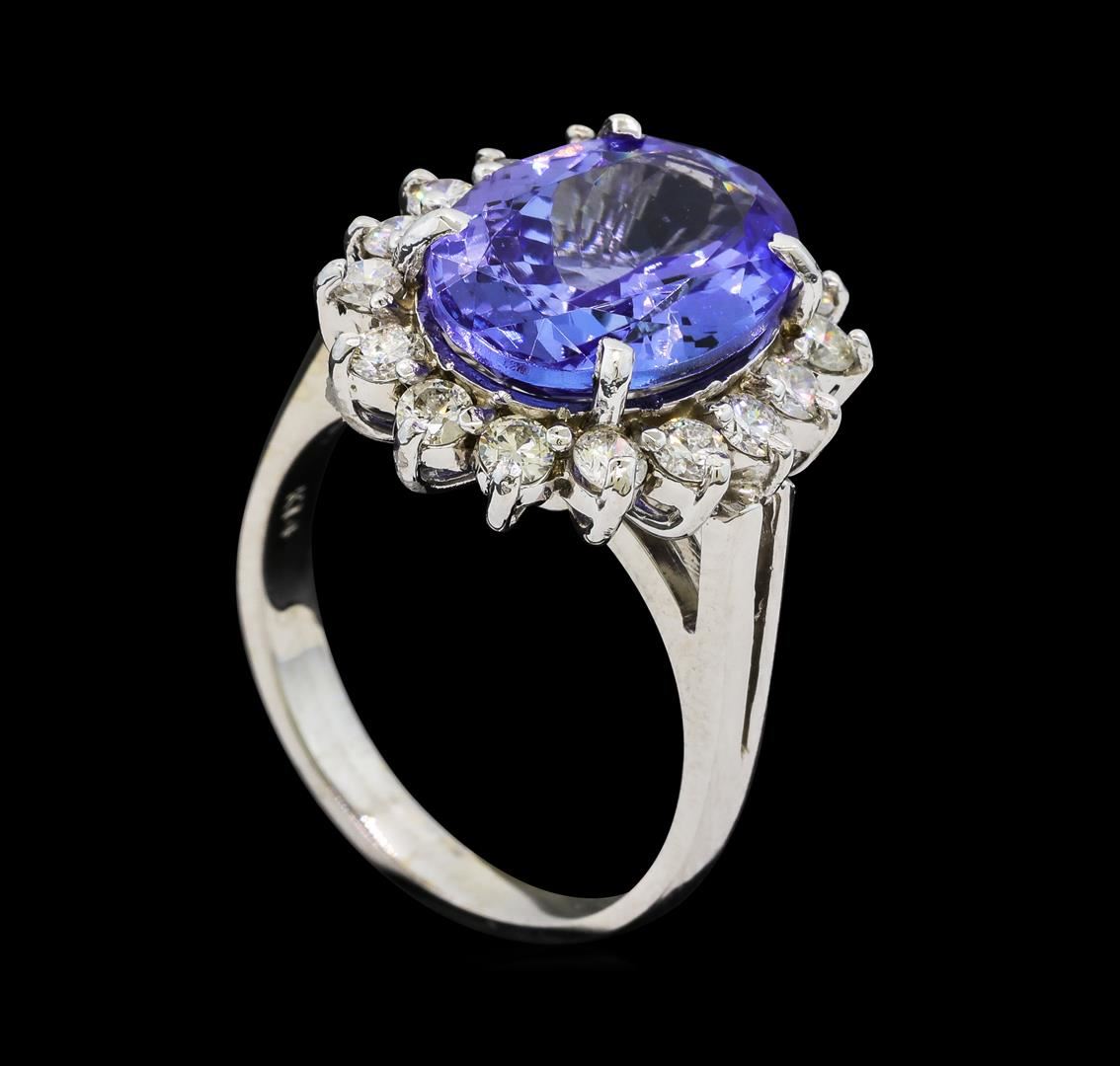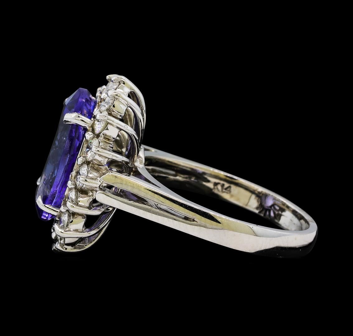 One electronically tested 14KT white gold lady's cast fashion ring with a split shank basket halo with a bright polish finish. The featured lady's ring has a shank measuring 2.71 millimeters wide. Identified with markings of 'K14'. Condition is new, good workmanship. Containing: One prong set oval modified brilliant cut natural tanzanite, measuring 14.00 x 10.10 x 6.04mm, (depth est.) 5%. bulge factor, approximate weight of 6.33ct., clarity is eye clean, medium light, moderately strong, violet color, (GIA V 4/4), cut is very good. Transmitting light with no distortion, transparent. Colored gemstones are presumed to have been subjected to commonly used enhancement processes. Graded in the setting. Sixteen prong set round brilliant cut diamonds, measuring 2.50 - 2.40 x 1.47mm (depth est.) approximate total weight of 16 Stones = 0.86ct. Graded in the setting. Clarity SI-1 to SI-2. Color: H - I Cut Good. Total Weight of Colored Stones 6.33ct.. Total Weight of Diamonds 0.86ct.. Total Weight of Ring 7.50gm. GAS Appraised at $10,315.00.