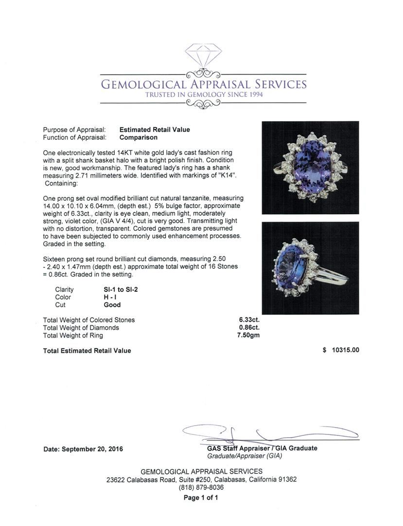 One electronically tested 14KT white gold lady's cast fashion ring with a split shank basket halo with a bright polish finish. The featured lady's ring has a shank measuring 2.71 millimeters wide. Identified with markings of 'K14'. Condition is new, good workmanship. Containing: One prong set oval modified brilliant cut natural tanzanite, measuring 14.00 x 10.10 x 6.04mm, (depth est.) 5%. bulge factor, approximate weight of 6.33ct., clarity is eye clean, medium light, moderately strong, violet color, (GIA V 4/4), cut is very good. Transmitting light with no distortion, transparent. Colored gemstones are presumed to have been subjected to commonly used enhancement processes. Graded in the setting. Sixteen prong set round brilliant cut diamonds, measuring 2.50 - 2.40 x 1.47mm (depth est.) approximate total weight of 16 Stones = 0.86ct. Graded in the setting. Clarity SI-1 to SI-2. Color: H - I Cut Good. Total Weight of Colored Stones 6.33ct.. Total Weight of Diamonds 0.86ct.. Total Weight of Ring 7.50gm. GAS Appraised at $10,315.00.