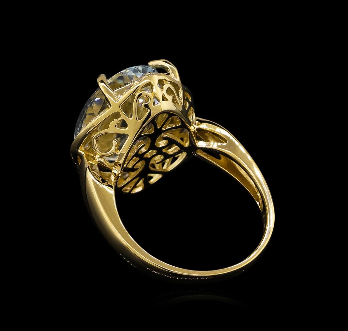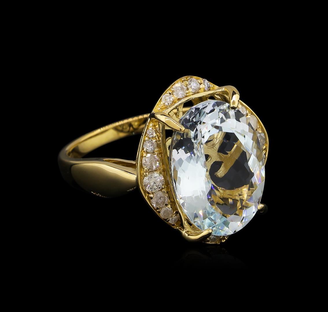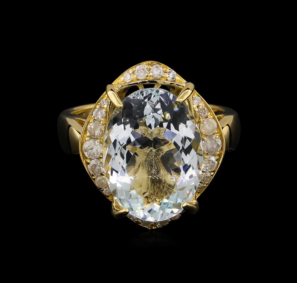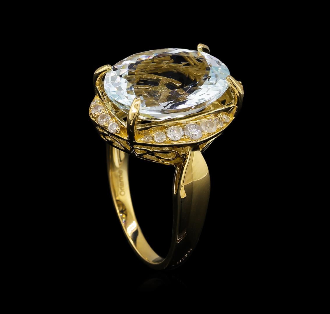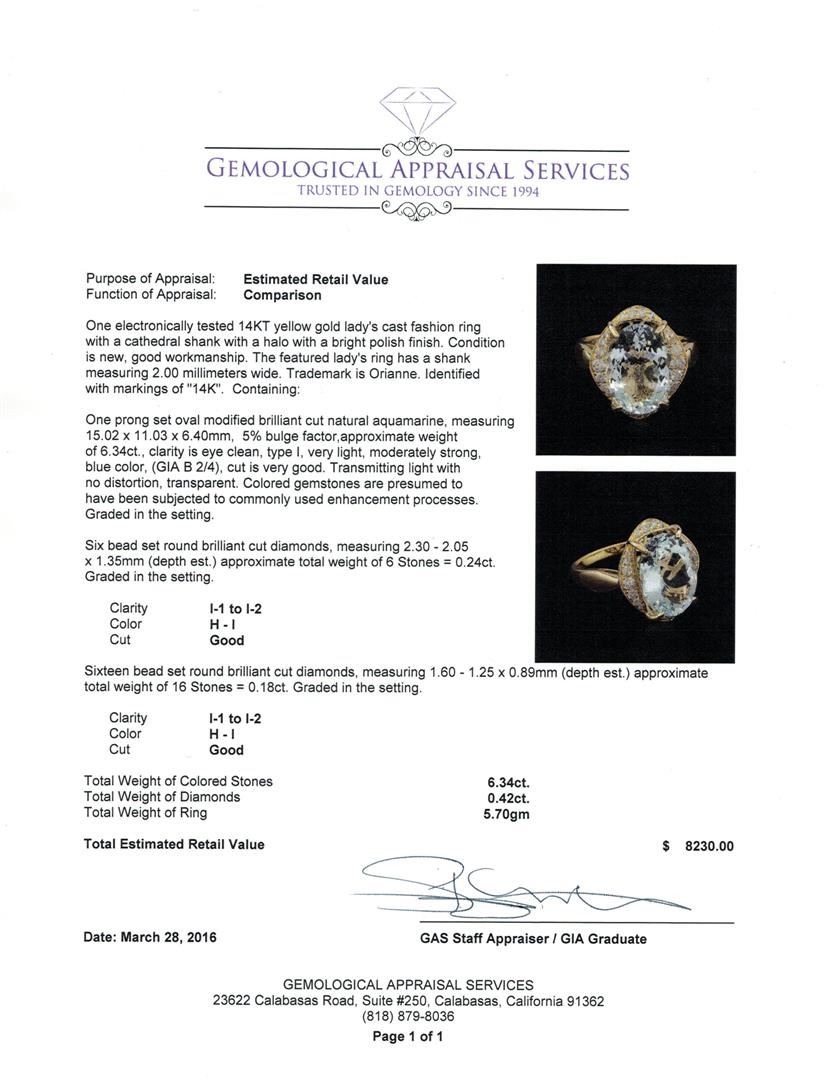 One electronically tested 14KT yellow gold lady's cast fashion ring with a cathedral shank with a halo with a bright polish finish. The featured lady's ring has a shank measuring 2.00 millimeters wide. Trademark is Orianne. Identified with markings of "14K". Condition is new, good workmanship. Containing: One prong set oval modified brilliant cut natural aquamarine, measuring 15.02 x 11.03 x 6.40mm, 5%. bulge factor, approximate weight of 6.34ct., clarity is eye clean, type I, very light, moderately strong, blue color, (GIA B 2/4), cut is very good. Transmitting light with no distortion, transparent. Colored gemstones are presumed to have been subjected to commonly used enhancement processes. Graded in the setting. Six bead set round brilliant cut diamonds, measuring 2.30 - 2.05 x 1.35mm (depth est.) approximate total weight of 6 Stones = 0.24ct. Graded in the setting. Clarity: I-1 to I-2. Color: H - I. Cut Good Sixteen bead set round brilliant cut diamonds, measuring 1.60 - 1.25 x 0.89mm (depth est.) approximate total weight of 16 Stones = 0.18ct. Graded in the setting. Clarity: I-1 to I-2. Color: H - I. Cut Good. Total Weight of Colored Stones 6.34ct. Total Weight of Diamonds 0.42ct. Total Weight of Ring 5.70gm. GAS Appraised at $8,230.00.