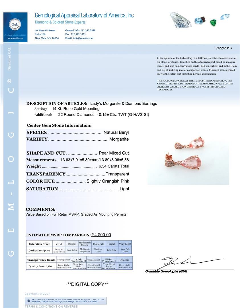 One Pair of Lady's Morganite and Diamond Earrings. Setting: 14 Kt. Rose Gold Mounting. Additional: 22 Round Diamonds = 0.15 Cts. TWT (G-H/VS-SI). Center Gem Stone Information: Species: Natural Beryl. Variety: Morganite. Shape and Cut: Pear Mixed Cut. Measurements: 13.63 x 7.91 5.80 mm/13.89 x 8.06 x 5.58 mm. Weight: 6.34 Carats Total. Transparency: Transparent. Color Hue: Slightly Orangish Pink. Saturation: Light. Total Weight: 2.65 grams.