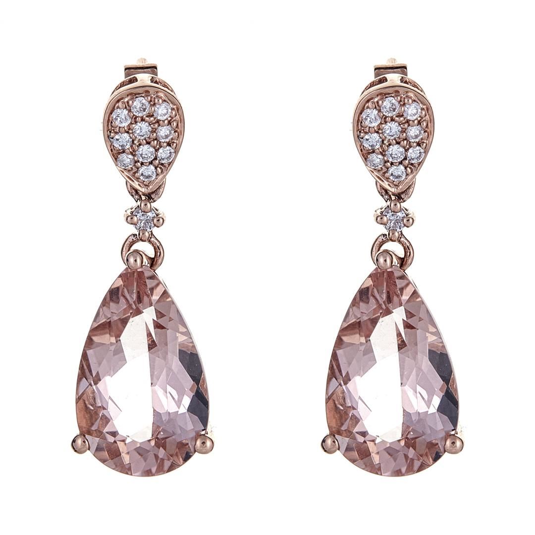 One Pair of Lady's Morganite and Diamond Earrings. Setting: 14 Kt. Rose Gold Mounting. Additional: 22 Round Diamonds = 0.15 Cts. TWT (G-H/VS-SI). Center Gem Stone Information: Species: Natural Beryl. Variety: Morganite. Shape and Cut: Pear Mixed Cut. Measurements: 13.63 x 7.91 5.80 mm/13.89 x 8.06 x 5.58 mm. Weight: 6.34 Carats Total. Transparency: Transparent. Color Hue: Slightly Orangish Pink. Saturation: Light. Total Weight: 2.65 grams.