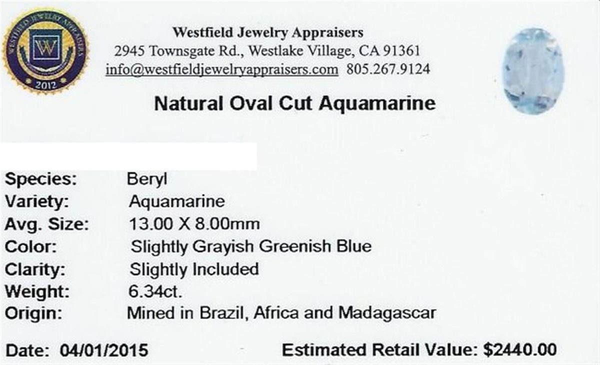 One oval mixed cut natural aquamarine exact weight 6.34ct., clarity is slightly included, type I, medium light, very slightly grayish, very slightly greenish blue color, (GIA vslgB 4/3), cut is good. Westfield Appraised at $2,440.00.
