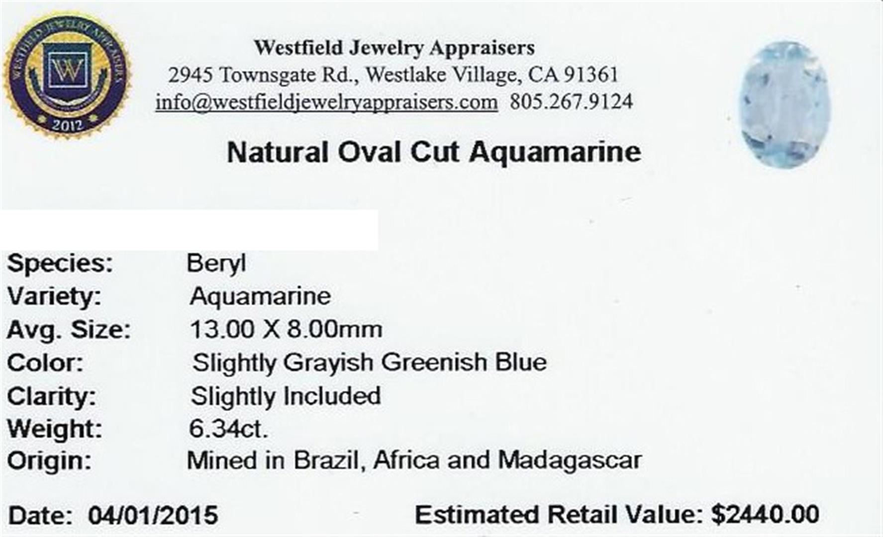 One oval mixed cut natural aquamarine exact weight 6.34ct., clarity is slightly included, type I, medium light, very slightly grayish, very slightly greenish blue color, (GIA vslgB 4/3), cut is good. Westfield Appraised at $2,440.00.