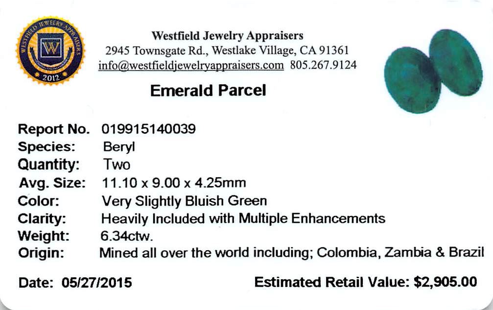 Two oval mixed cut natural emeralds, measuring 11.10 x 9.00 x 4.25mm, exact total weight 6.34ct., clarity is heavily included, medium dark, very slightly grayish, very slightly bluish green color, (GIA vslbG 6/3), cut is good. Transmitting light somewhat diffusely, translucent, Naturally occurring internal & external characteristics are present, Indications of multiple laboratory enhancements, including high temperature heat treatment. Westfield Appraised at $2,905.00.